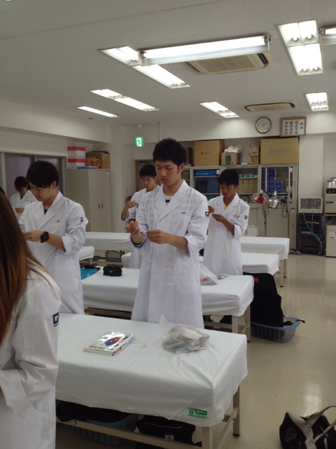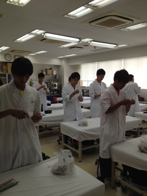 授業では、1分間に片手挿管がどれだけできるか練習しています。