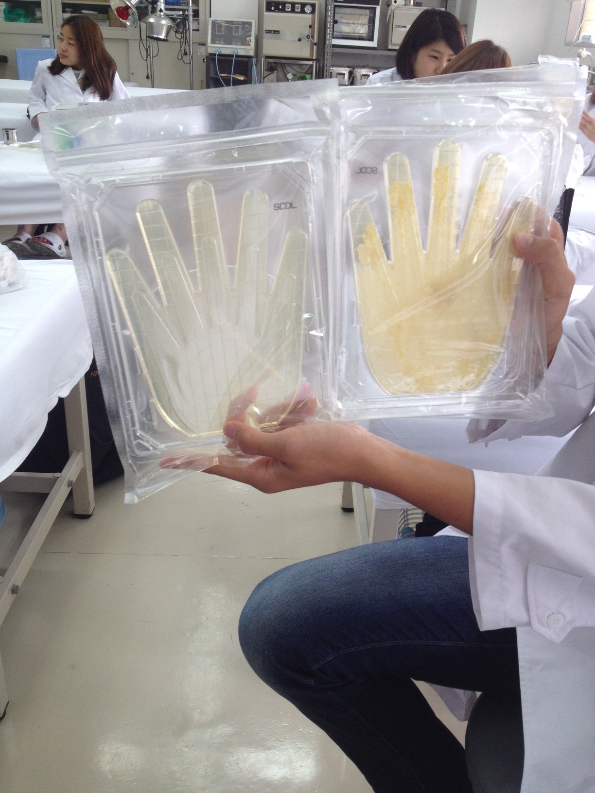 実験の流れは手を洗い、消毒したあと身の周りにあるものに