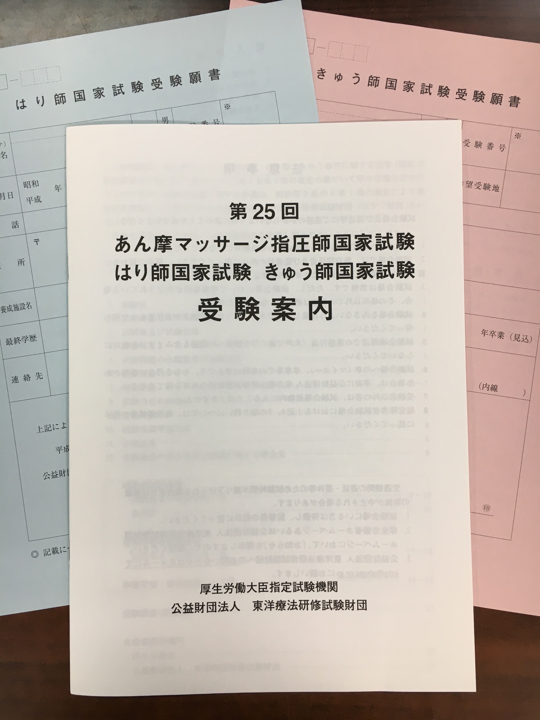 2016.12.22 国家試験願書 3年生にとって最大のイベント! はり師・きゅう師国家試験が迫ってきました。 今年度は、平成29年2月26日(日曜日)です。 大阪会場は、和泉市にある桃山学院大学です。 学生の受験願書は、すでに送付済みです。 残り2ヶ月ほどとなりました。 正月をはさみますが、気を緩めることなく過ごして欲しいと思います。 前の記事 記事一覧 次の記事