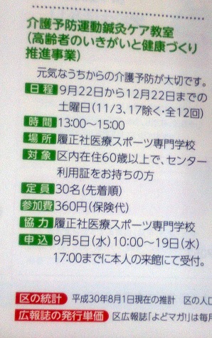 2018.09.03 介護予防の運動教室と鍼灸 後期、鍼灸学科の介護予防の運動と鍼灸の教室が始まります。 その告知が今月の淀川区の広報誌「よどマガ」に載りました。 (よどマガです。) 前期に8月まで行いました。今回、新たに12月まで行います。 (ちょっとピントが・・・) また沢山の方にお会いできるのでしょうか? 今から楽しみです。 学生も加わり、最後まで頑張りま~す。 前の記事 記事一覧 次の記事