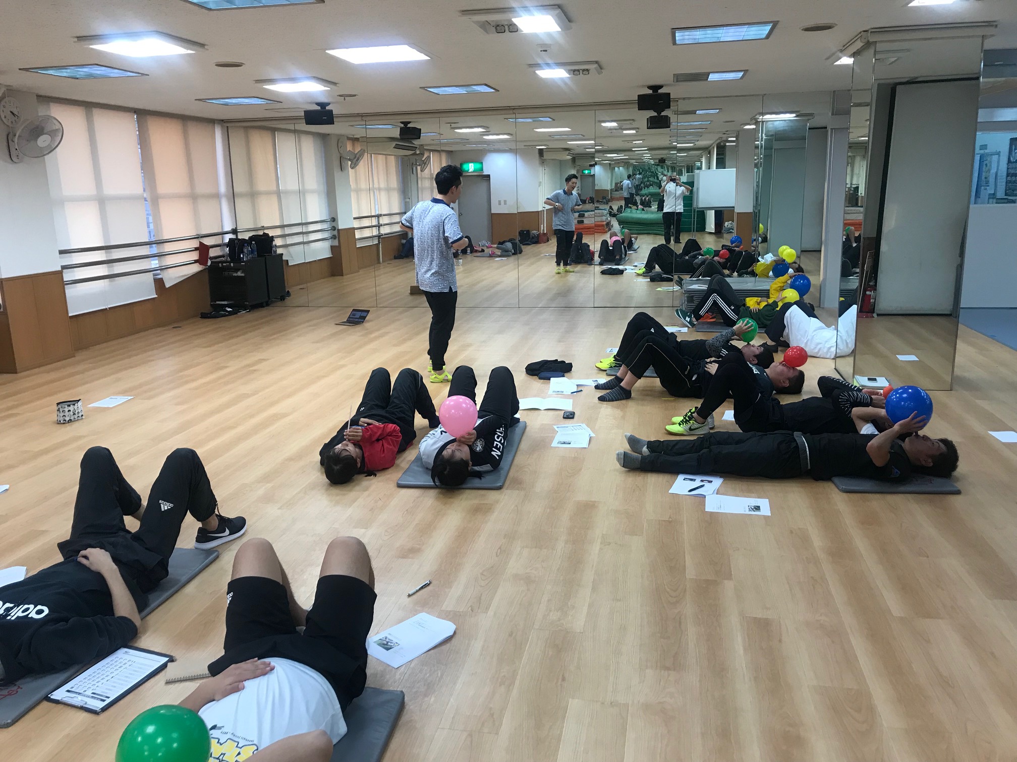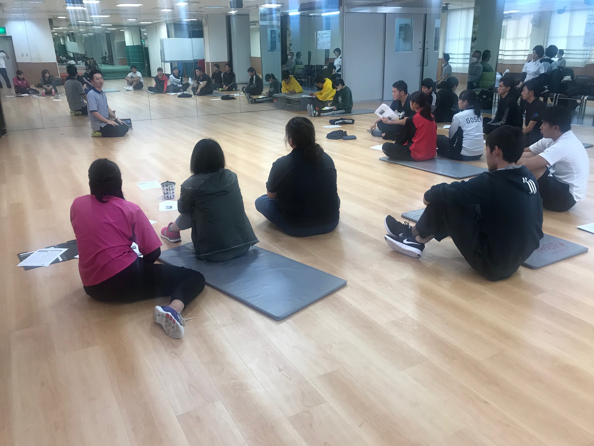 後半の実技では、まず呼吸を観察。そして、正しい呼吸をまなび、それを実践しながらのトレーニング![]()