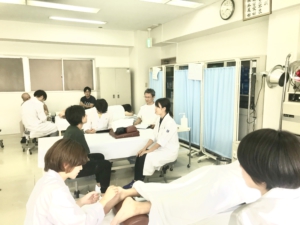 少人数のチームに分かれて医療接遇や治療技術などさまざまな観点から複数の教員が学生にフィードバックを行いました。今回のことを踏まえて実際の患者さんにより良い治療を提供できるようになってくれれば!と思います。