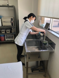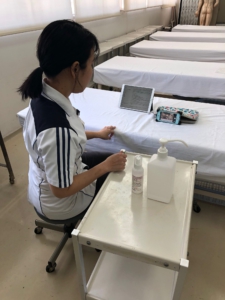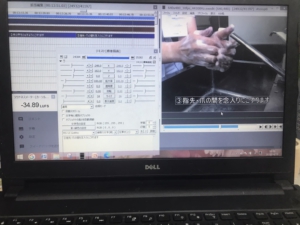 「きゅう実技」担当の井前先生が「手洗い・手指消毒」についての動画を作成している様子です。
