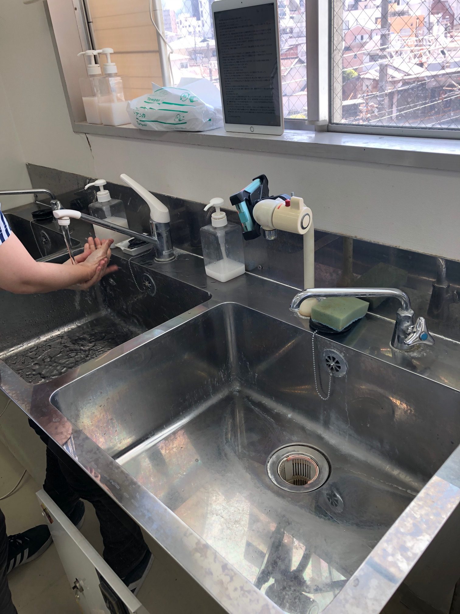 「きゅう実技」担当の井前先生が「手洗い・手指消毒」についての動画を作成している様子です。