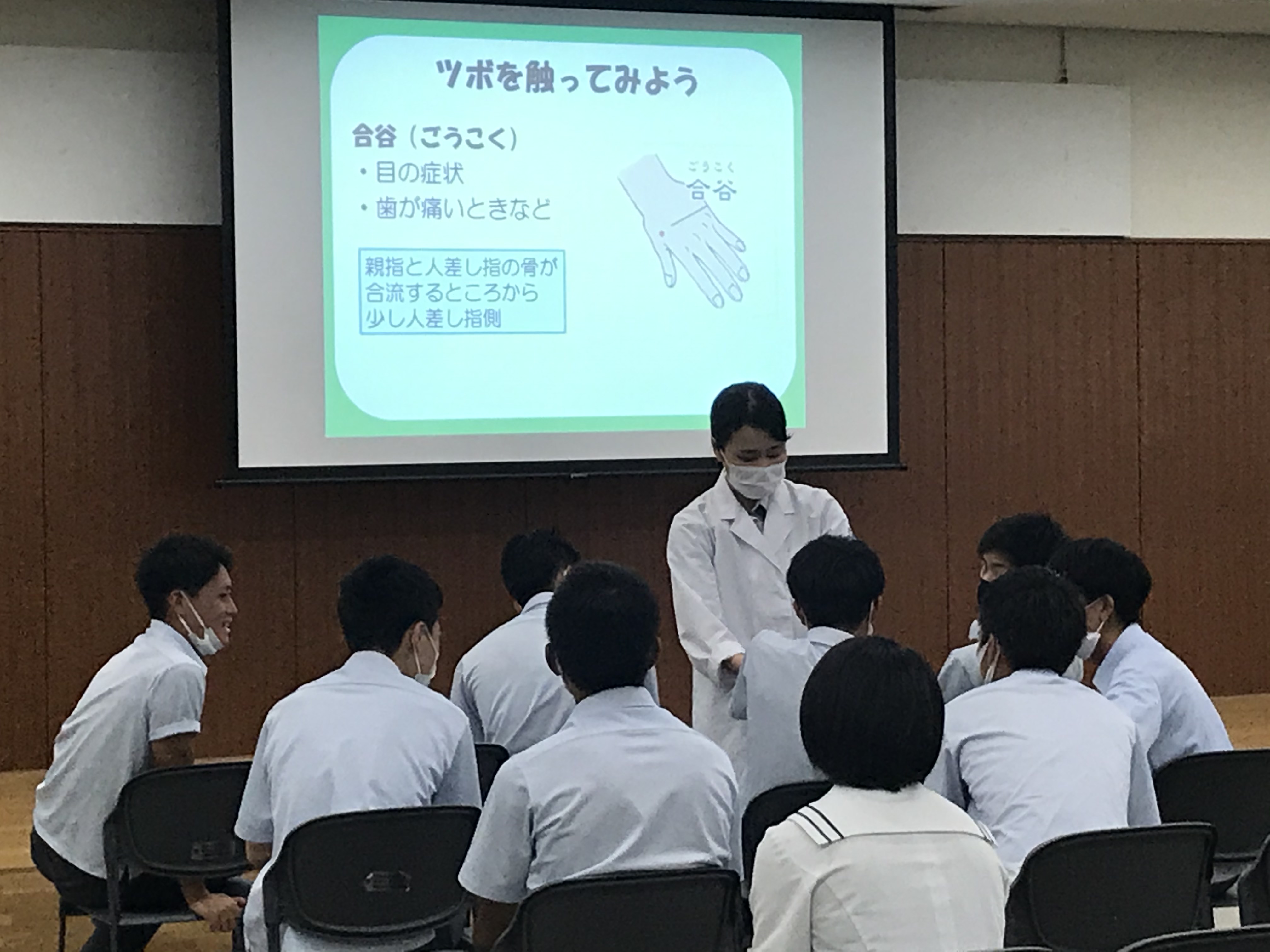 鍼灸を知ってもらい、みなさんの健康を、そして部活動での活躍を期待して、生徒のみなさんが日頃から使えるツボの紹介や、姿勢についてのレクチャーなど、数日に分け、50分授業を6コマいただいています。