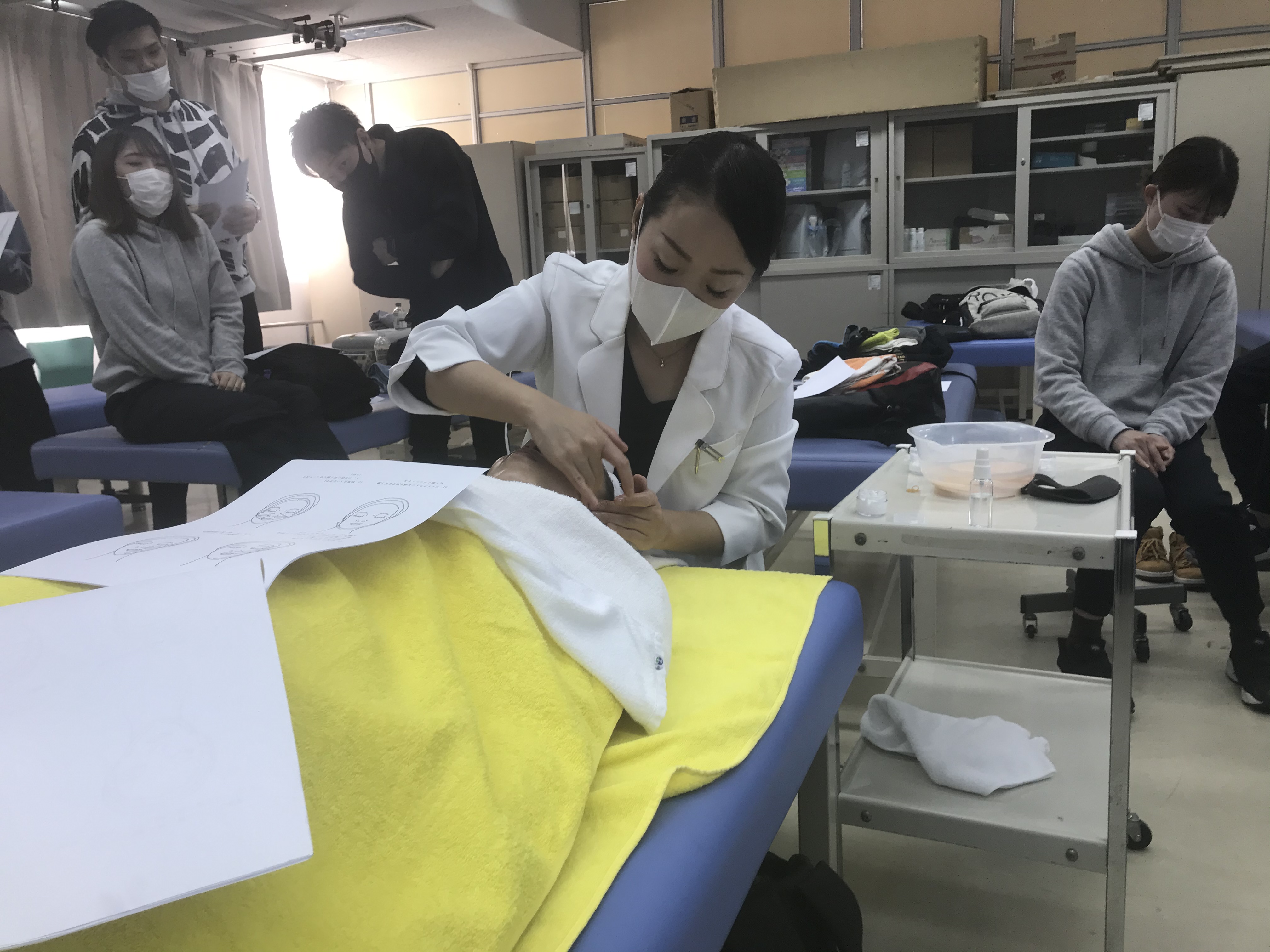 まずはデモで鈴木先生が学生の顔へ施術を行います。