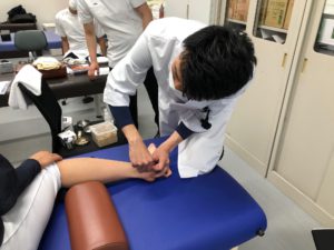 『肩が痛い』、『肘がのびにくい』そして『腰がだるい』など様々な症状に対して、指導教員の指示の下、学生自ら”ガチ”で治療するという実習です。