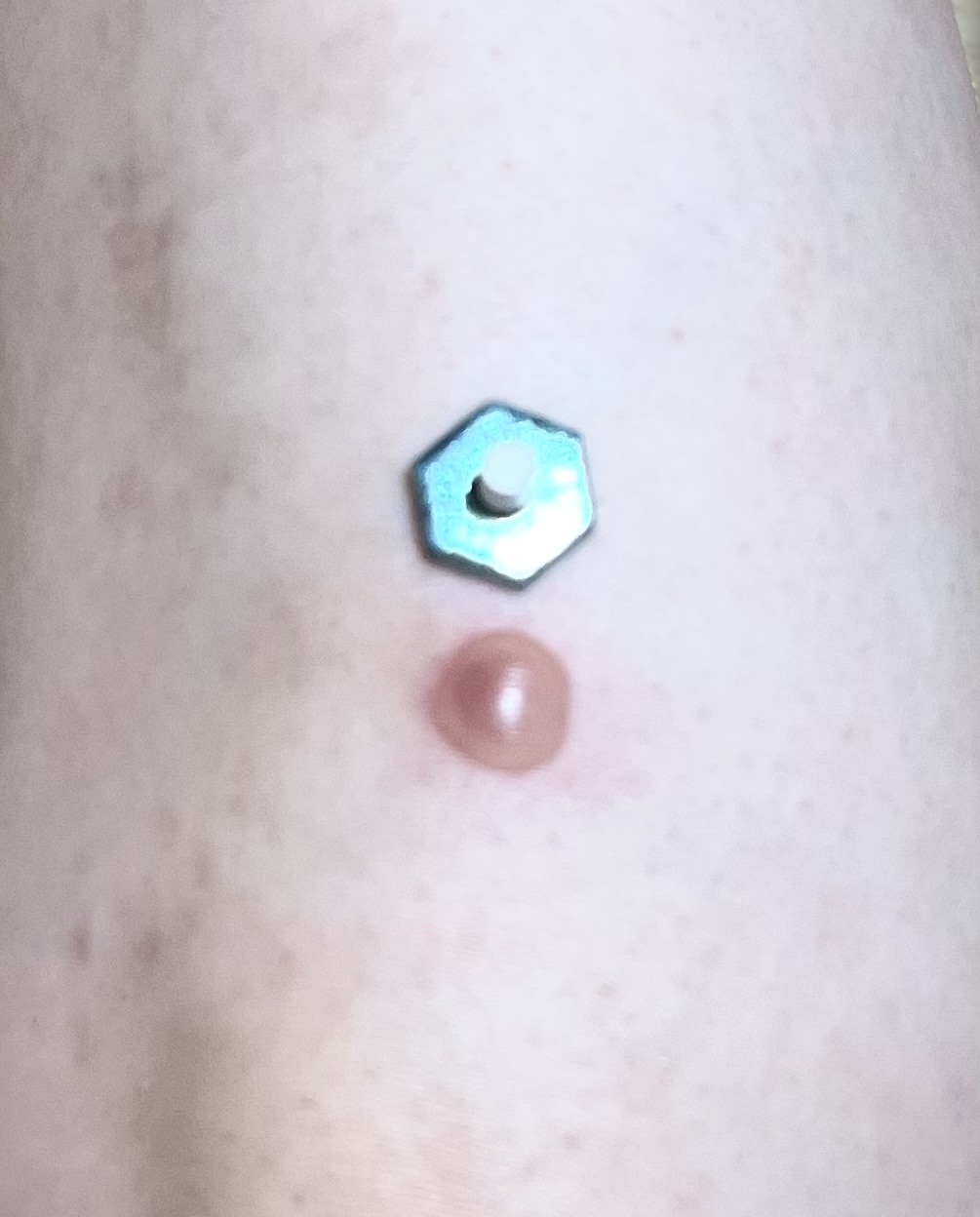 実際に据えたお灸を出来た水ぶくれの横に並べてみました。