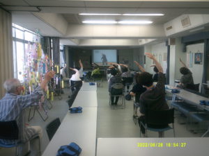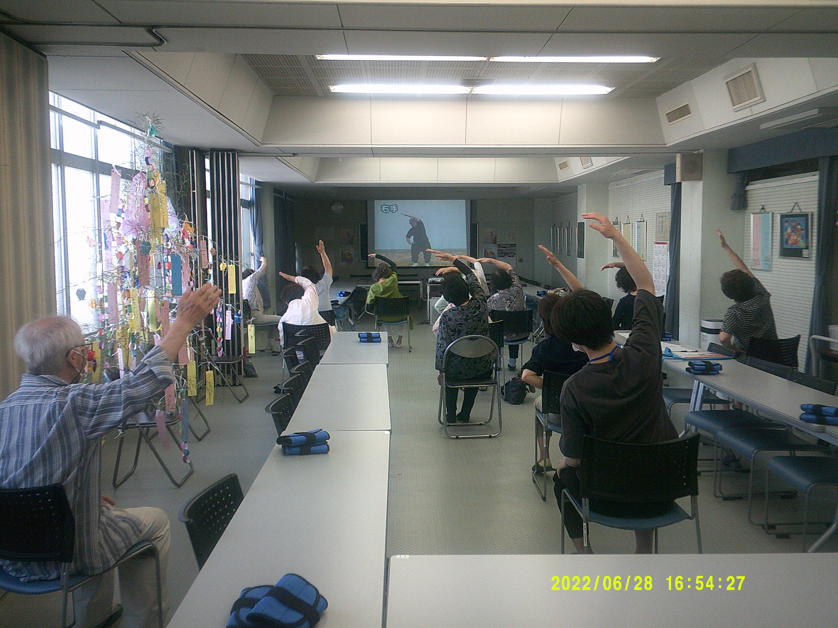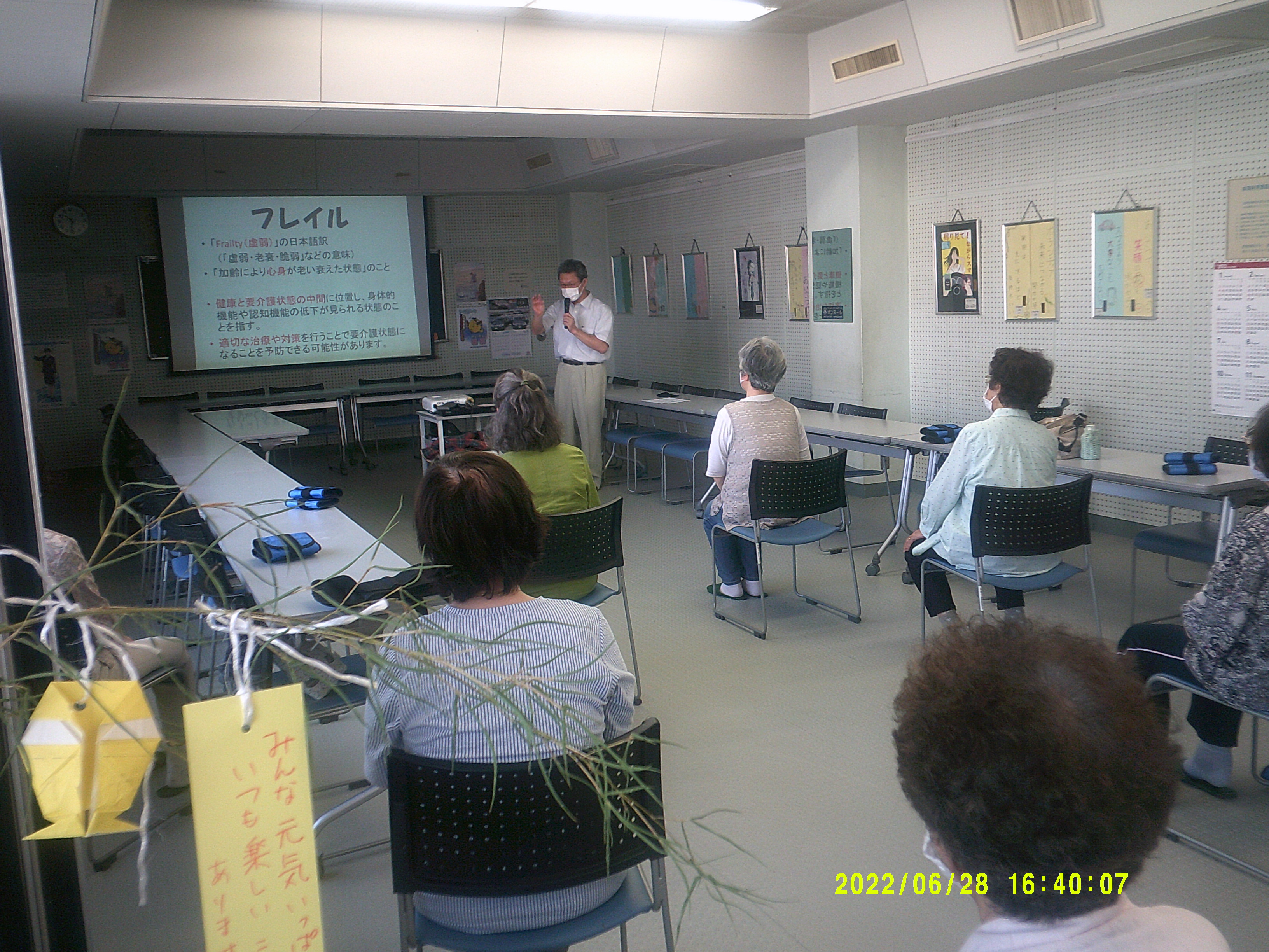 2022.06.30 介護予防運動・番外編① 本日は、学校の実習を離れ、淀川区社会福祉協議会さんの関係から地域の「百歳体操教室」にミニレクチャーをさせていただきました。今回は、東三国の地域です。 (奥で話してます。) テーマは、「フレイルと認知症」です。 会場には20人ぐらいの方が集まっておられ、熱心に聞いていただきました。会場は、普通に公民館ですが、会場が変るといつもの「百歳体操」もとても新鮮でした。 (写真は「立ち上がりの運動」をされている場面です。) 会場には、七夕飾りもあり、季節を感じながらの体操教室でした。 また、伺いますね。 前の記事 記事一覧 次の記事