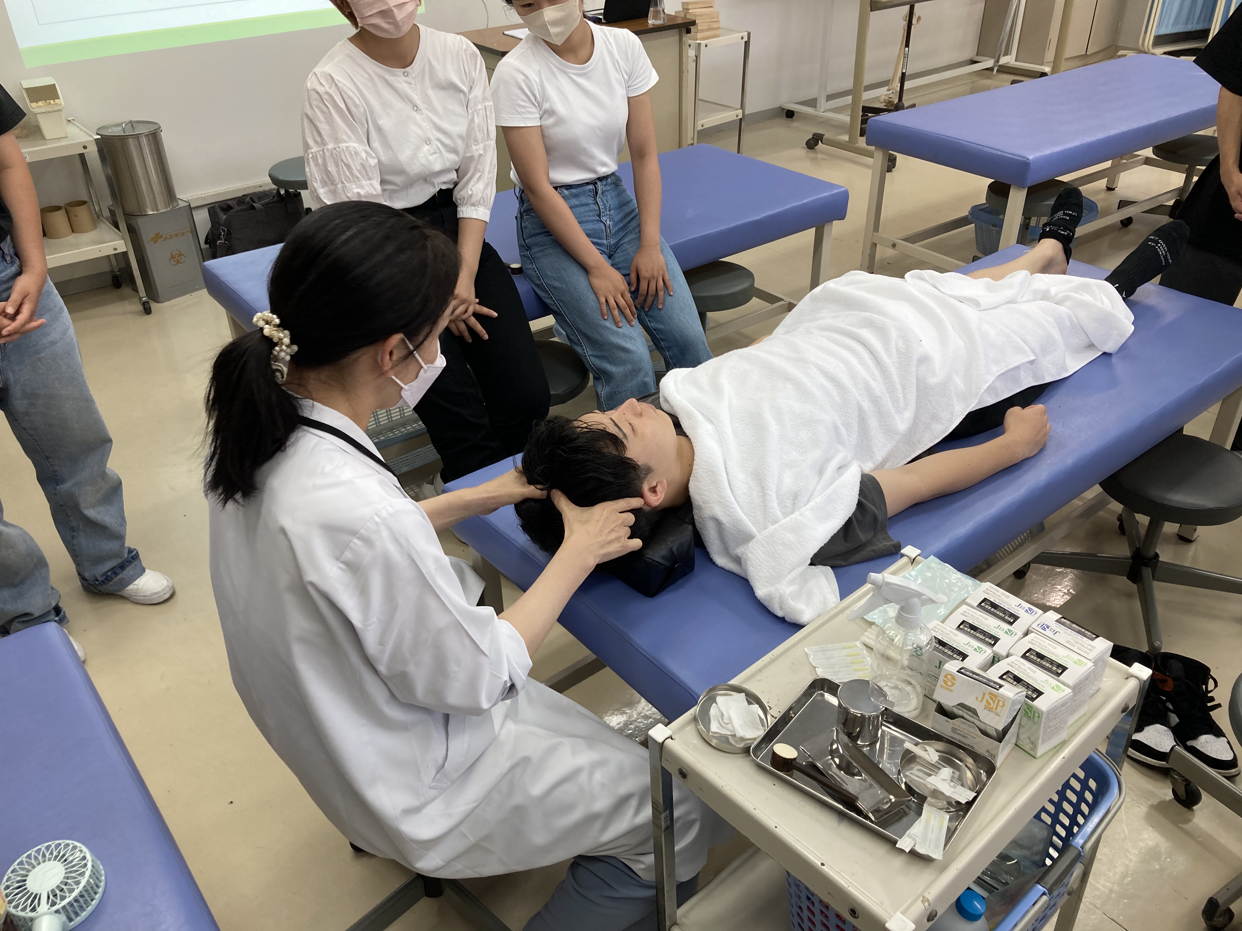 学生たちも顔もそうだけど「頭」がめちゃくちゃこたえた・・・!とのことで、頭皮も顔面の筋肉と関係しますから、頭に鍼を刺すだけで充分効果を実感されておりました(^^)