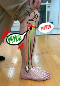 この腓骨頭斜め前の場所にあたるツボが「陽陵泉」になります。