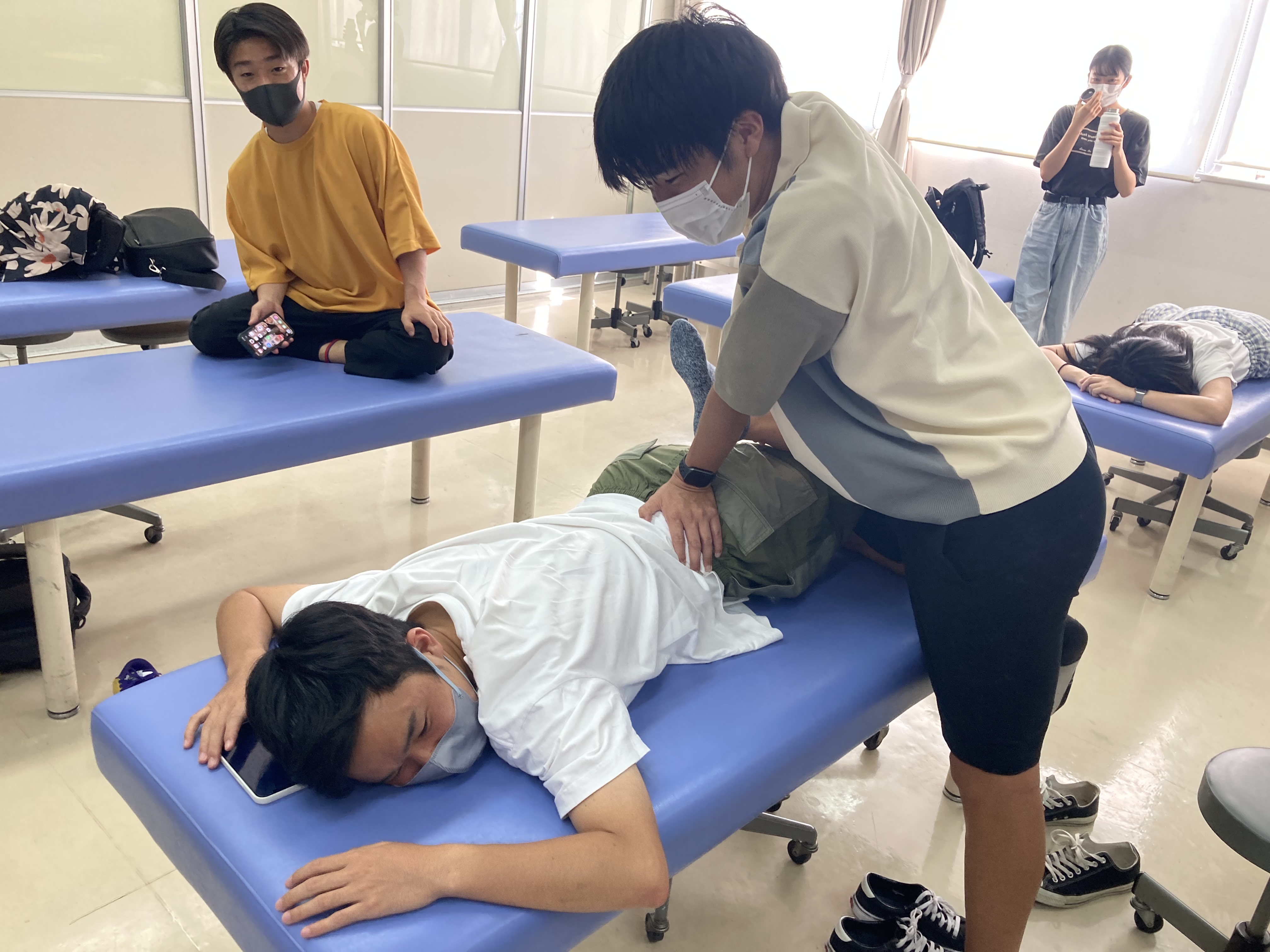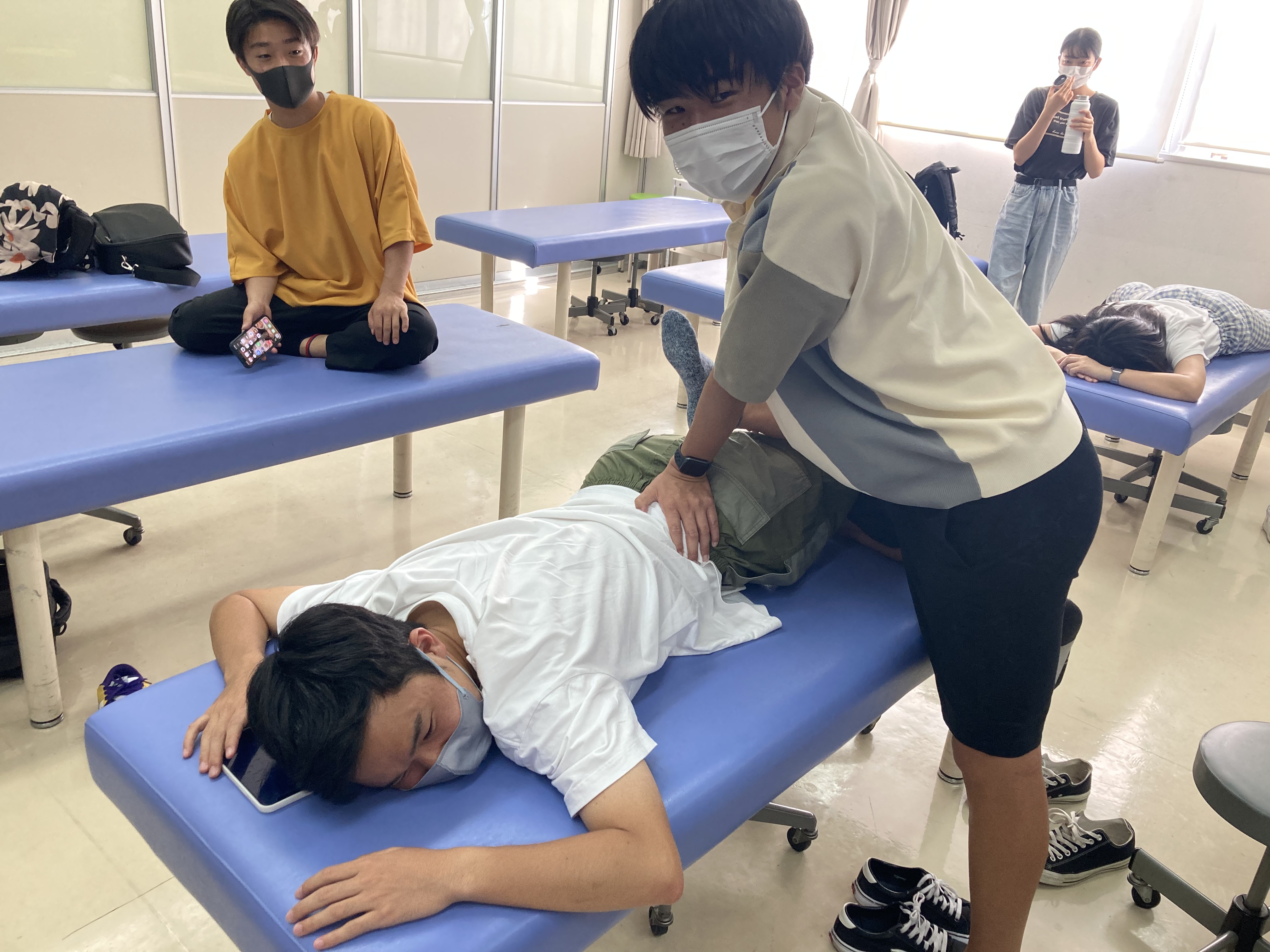 様子を見に皆さんが練習している様子を覗きに行くと、多分ATの実習の練習でしょうか。ストレッチをされていました。