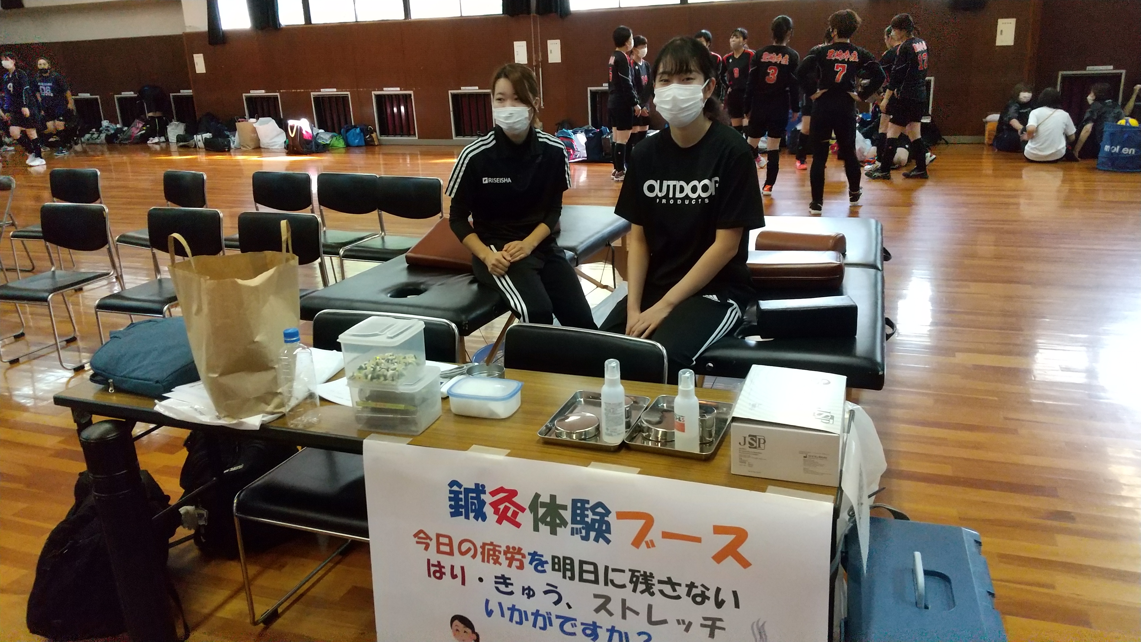 本部席の一角にスペースをいただきましたが、広い部屋のまん中で、みんなに見られながら治療を受ける?と思っていましたが、すぐに「腰痛いんだけど、見てくれる~?」と1人目の方が来られてから沢山の方の施術をさせていただきました。履正社はスポーツとの関係が強いのですが、普段は高校や大学生をみることが多いのですが、今回はお母さん世代で、いつもと違う世代の方をみることは、学生の2名にとっても貴重な経験となったかと思います。