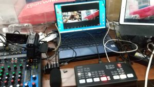 (左は音声ミキサー、中央手前は画面のスイッチャ―。)