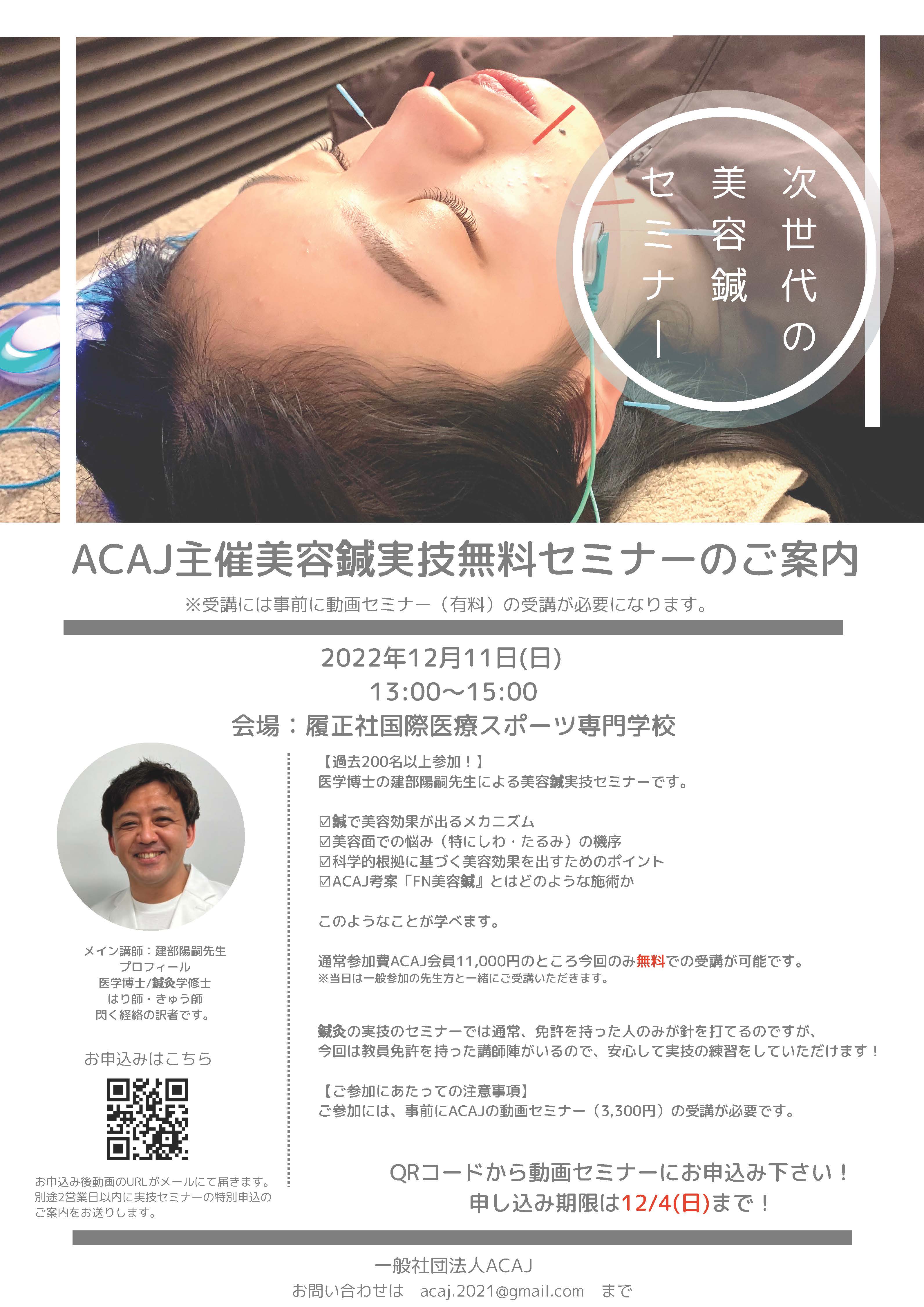 2022.11.30 12/11・美容鍼灸セミナー 以前、履正社で教員をされていた建部先生が美容鍼のセミナーをされます。 履正社の学内でのセミナーであり、興味を持っていただければ嬉しいです。 美容鍼灸のセミナーは怪しいと感じることもあるのですが、 研究熱心で多方面に活躍されている先生であり、 医学的な背景を持った論理的な講演が聞けることと思います。 興味がある方は、是非参加して欲しいと思ってます。 前の記事 記事一覧 次の記事