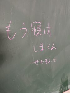 2023.01.17 学内ナニコレ珍百景 先日学内を歩いていたら奇妙な風景に出会いました。 寄ってみましょう。 人知れず書かれた反省文とそれに対するツッコミ。 書いたのがどの学科の学生かわかりませんが、 その後寝坊してないことをこっそり祈るばかりです。 前の記事 記事一覧 次の記事