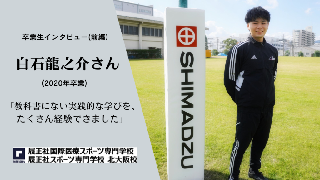 【白石さんprofile】1998年生まれ、大阪府立豊島高校出身。2020年鍼灸学科卒業(医療+AT)。はり師、きゅう師、日本スポーツ協会公認アスレティックトレーナー。現在、島津製作所ラグビー部SHIMADZU Breakersトレーナー、島津製作所野球部アシスタントトレーナー、甲南中学・高校ラグビー部トレーナーを務める。島津製作所内トレーニングジム内で、選手のみならず一般社員の方向けにもトレーニング指導も行っている。