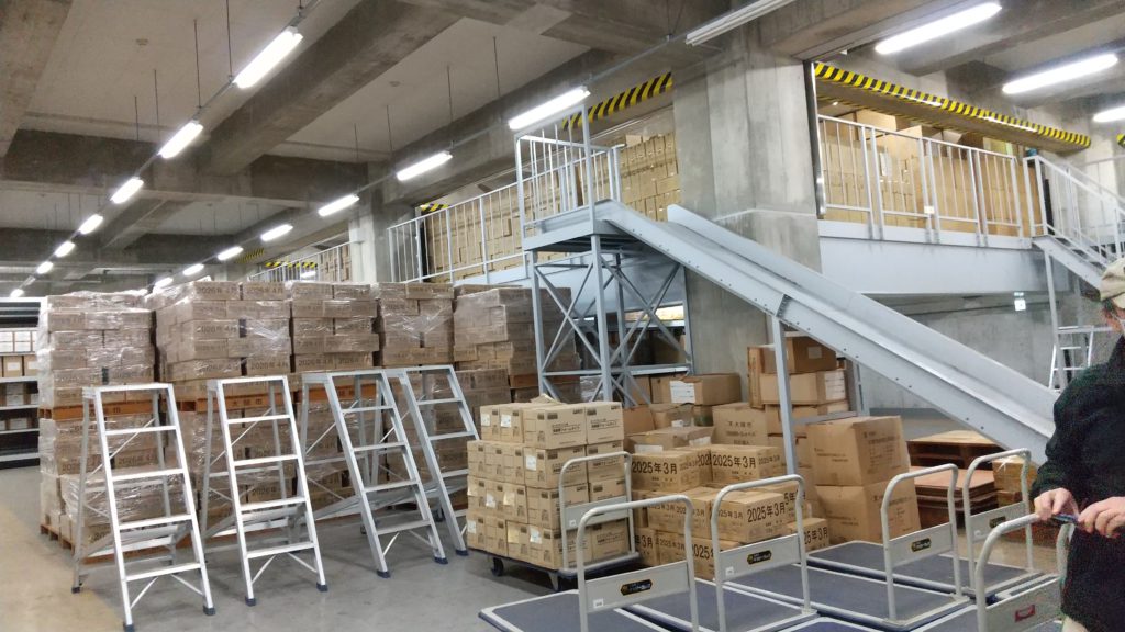 また、災害に備え生活用品の備蓄をされている倉庫も見せていただきました。