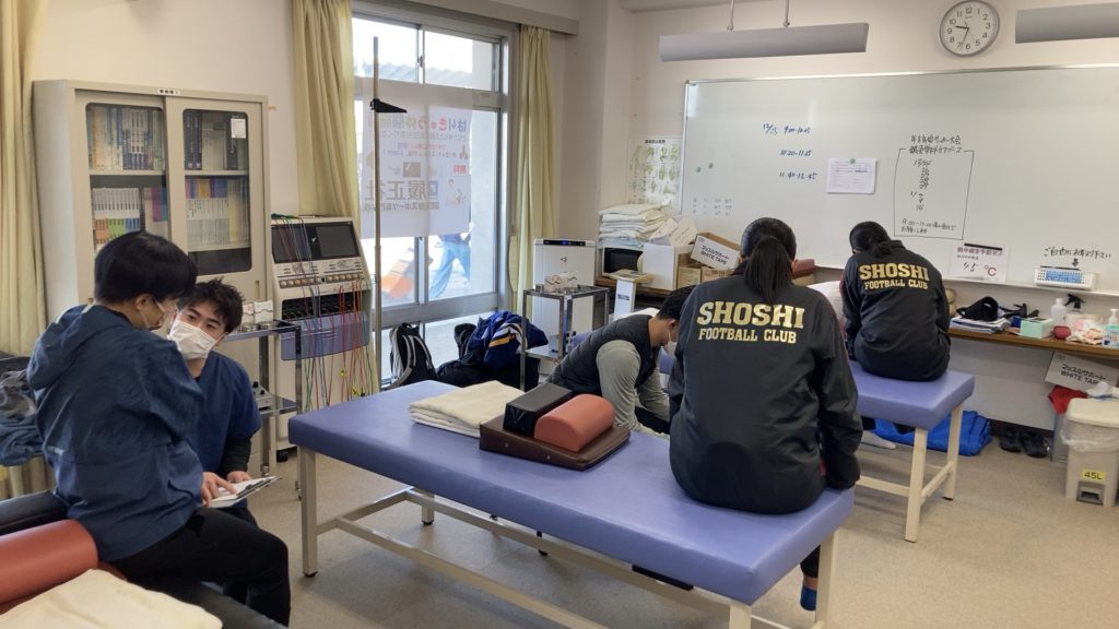 12月28日の実習では女子サッカー名門校が茨木キャンパスで試合を行なっており、その選手達が普段の疲労やその日にした怪我などを教員が監視している中で実習を行いました。