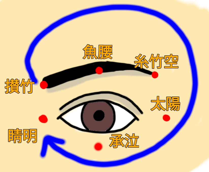 眉毛の内側にある「攅竹(さんちく)」から眉の真ん中「魚腰(ぎょよう)」、眉の外側「糸竹空(しちくくう)」の順に