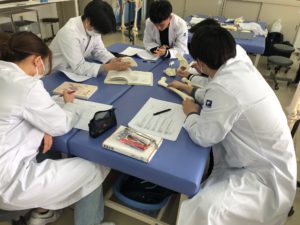 この実習は、クラスを5,6人のグループ分け、メンバーで協力しながら、骨標本を手に骨の部位・名称の確認、立体的な構造を理解していくものです。加えて、教科書に記載されていることを実践で使えるよう理解していきます。