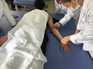 『触れてなんぼ』ですから、学生同士でお互いの体に触れながら人体の触察に生かしていきます。