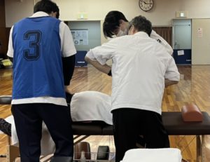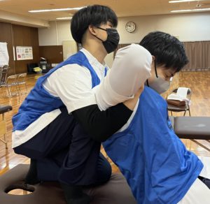 空いた時間には2年生が1年生に施術する姿は