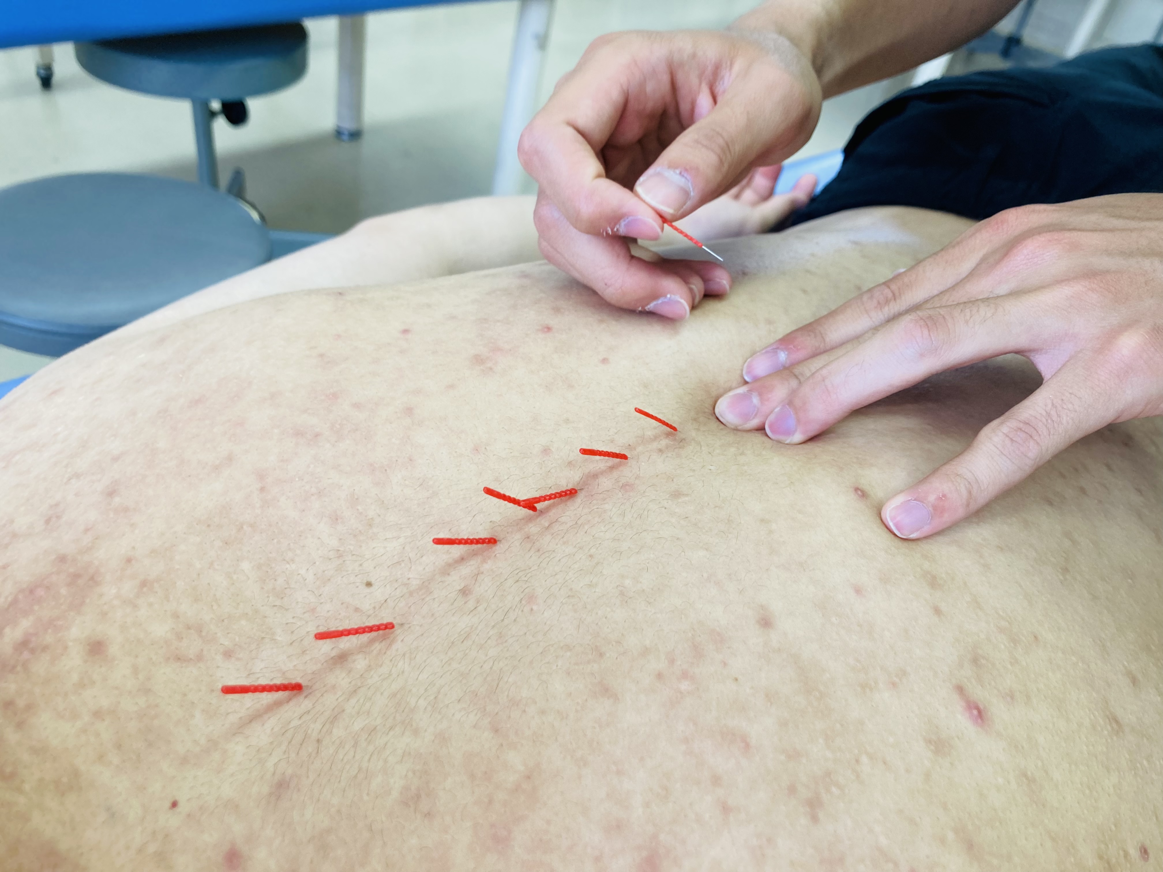 鍼を打たれている田中くんは肩や背中のコリ、皮膚も弱いためしっかりめに鍼をしました。