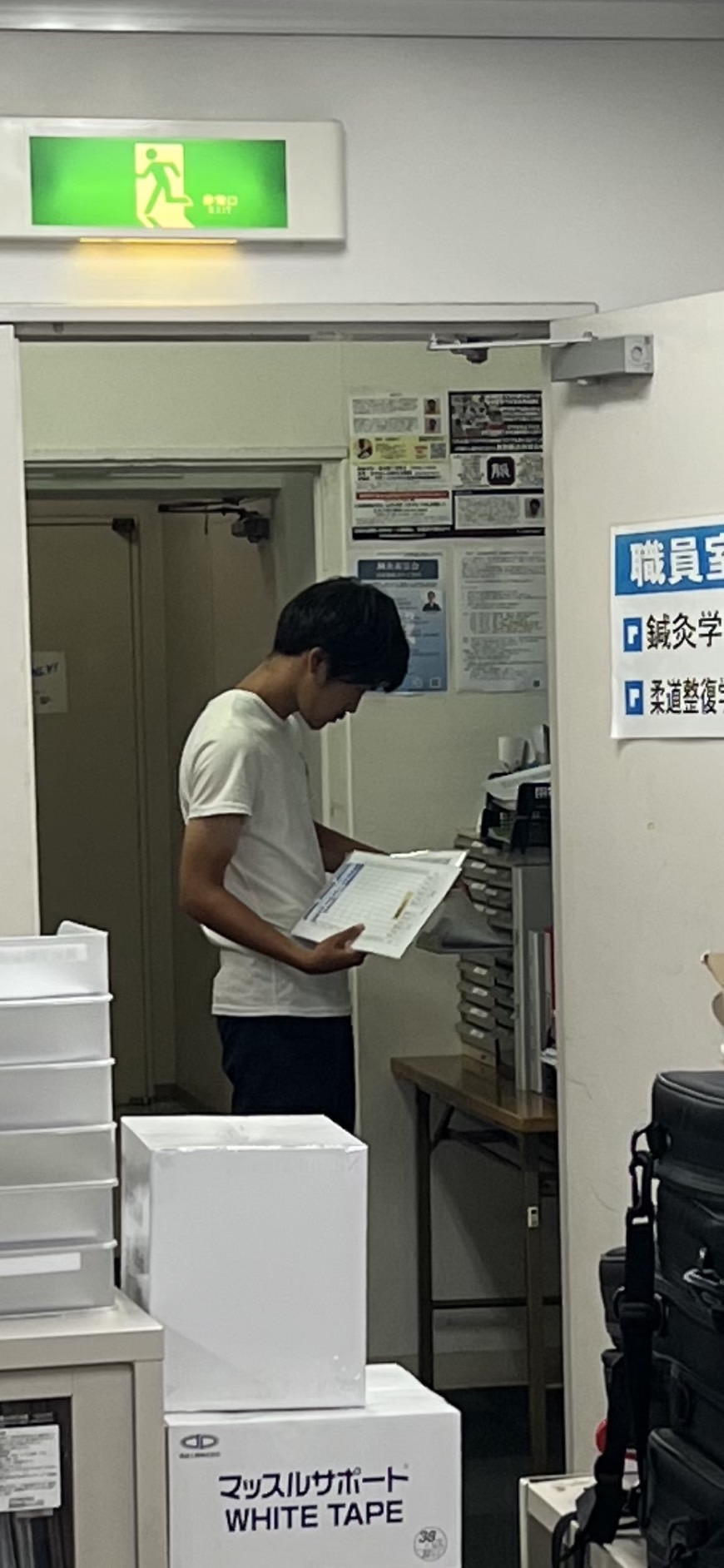 鍼灸学科の教員室の前には、経穴を覚えるツールのプリントが棚にあります。