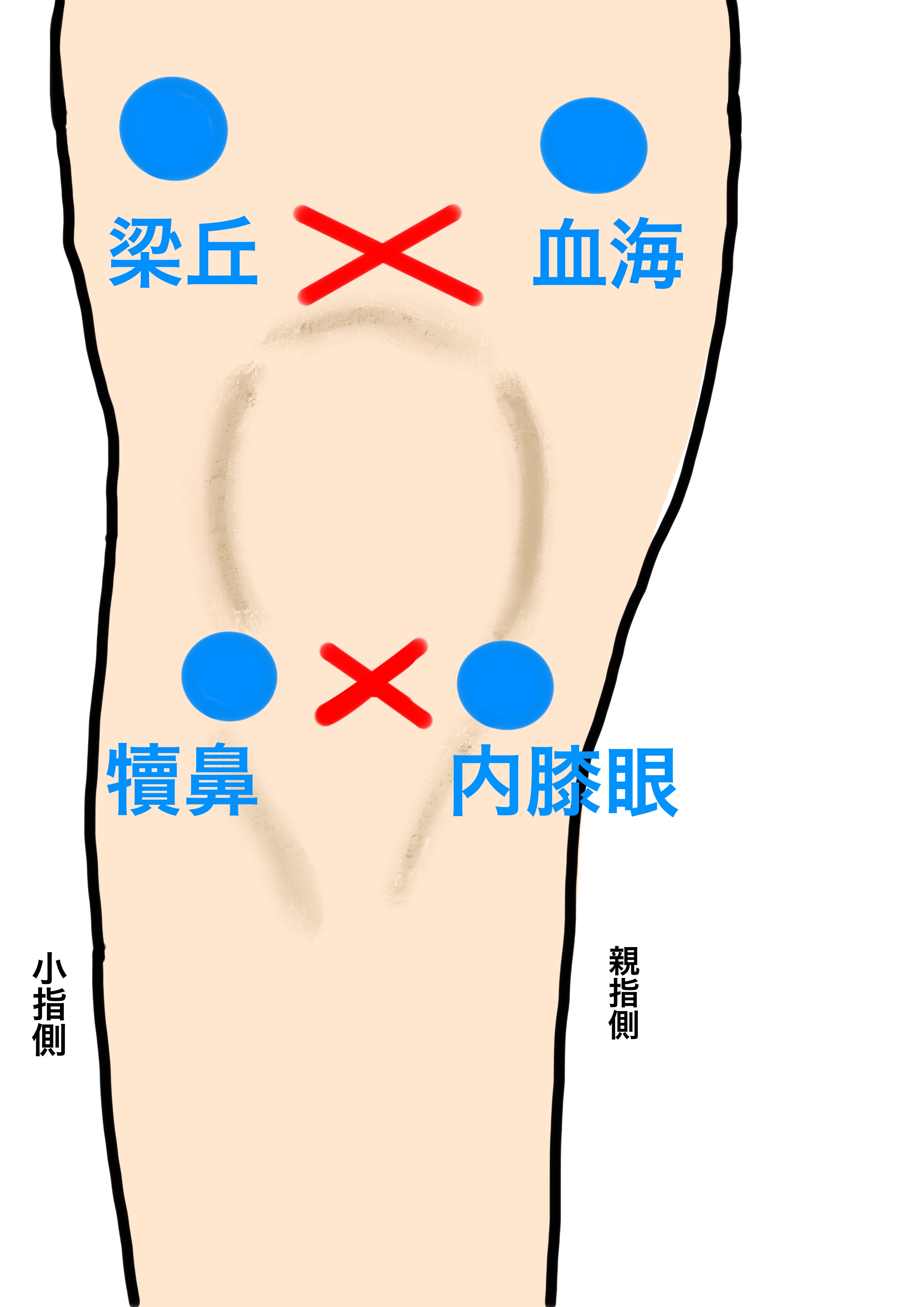 梁丘と血海は膝のお皿の上の角から人差し指〜薬指の3本分上、犢鼻と内膝眼はお皿の下に腱があるので、その両サイドにあります。