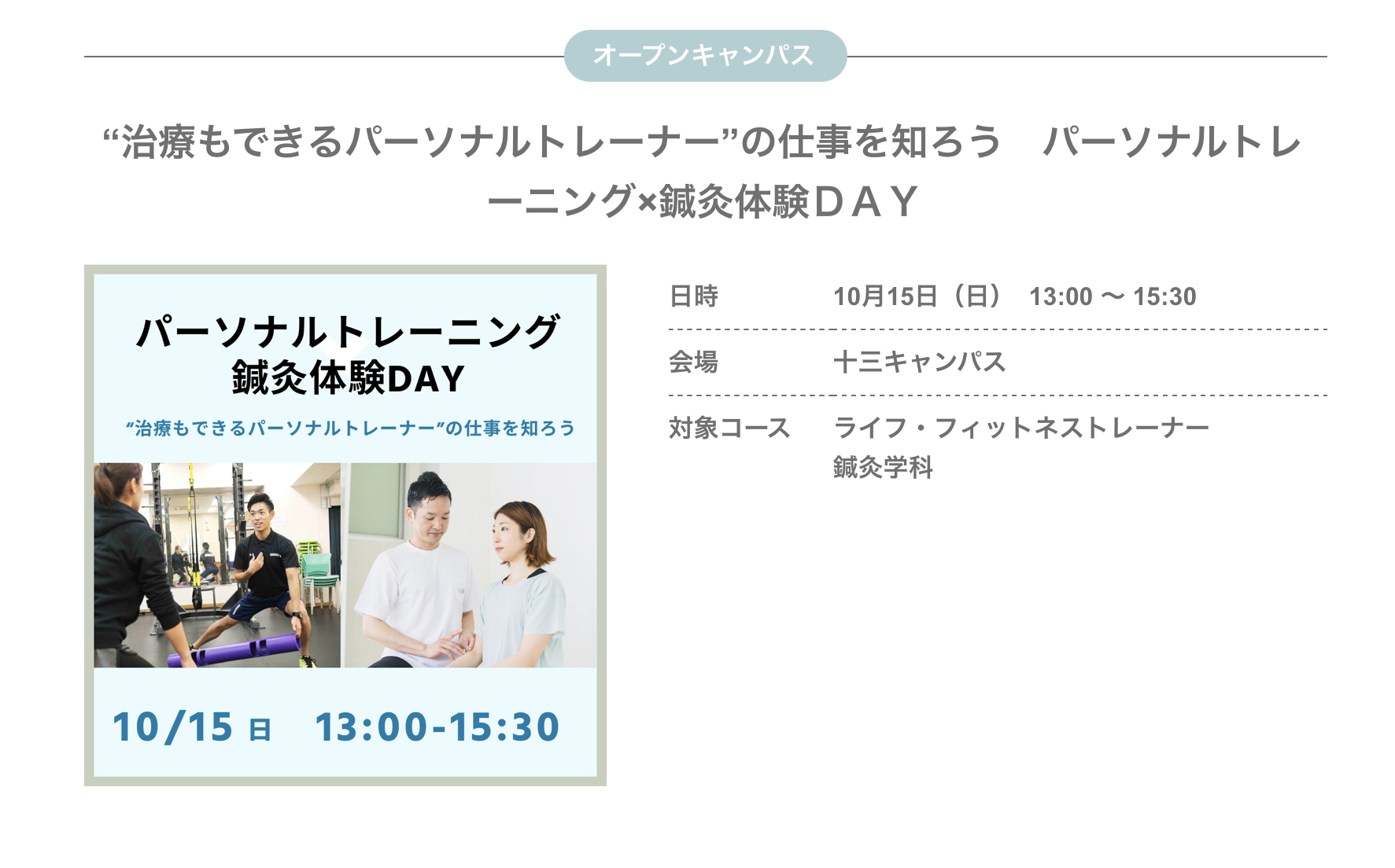 10月15日(日)に医療(鍼灸)+パーソナルトレーナー専攻のオープンキャンパスを行います!