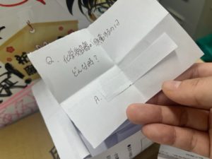 2024.02.16 教員室来るとき引いてって~ 国試まであと1週間半、問題を取りにきたり 質問に3年生が繁く通う教員室の入り口に 一問一答くじを設置してみました。 中を開くとこんな感じで国試に関係する問題が書いてあります。 どんな科目のどんな問題が出るかは完全ランダム。 息抜きのついでに解いてってみてください。 前の記事 記事一覧 次の記事