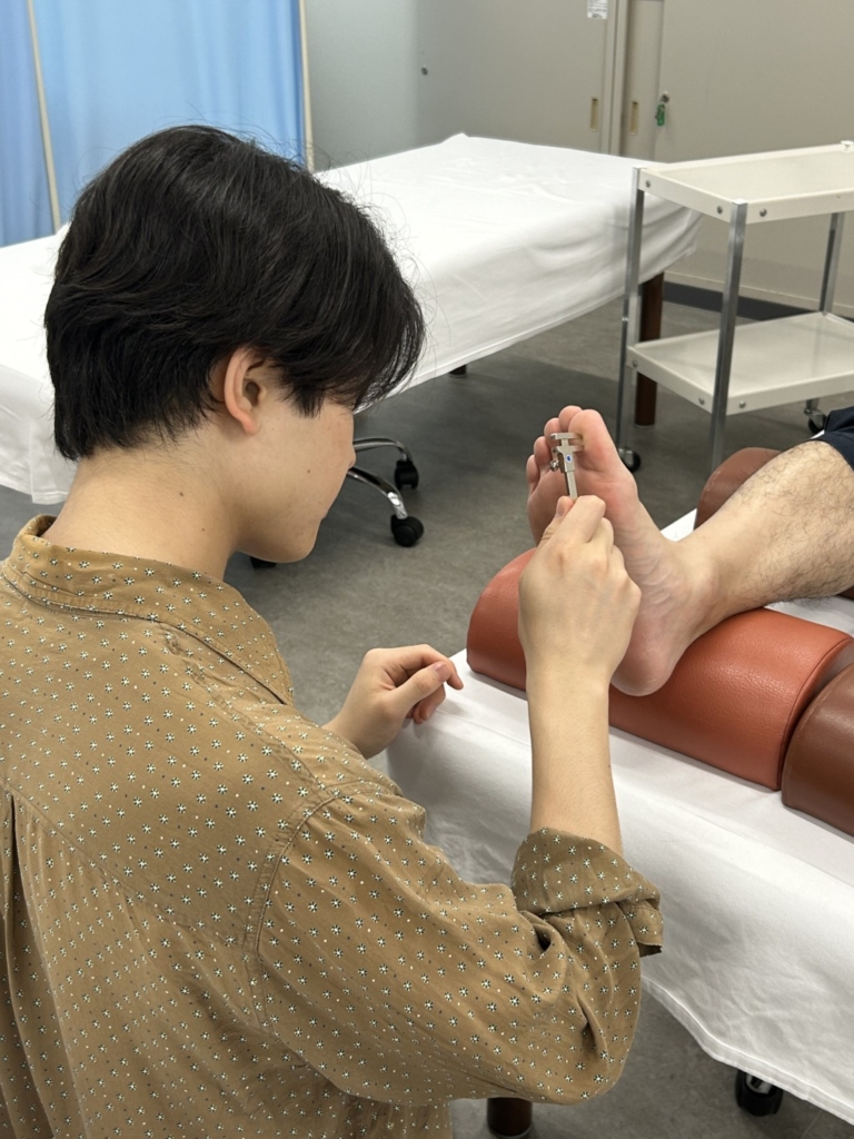 痛覚の分布を調べるために、二点弁別閾というものを測ります。金属の先がとがっていて、皮膚に当たるとちくっとするのですが、そのちくっとする二点が区別できる距離をどれだけせばめられるかを計測していきます。研究発表会が楽しみな演題のひとつです★