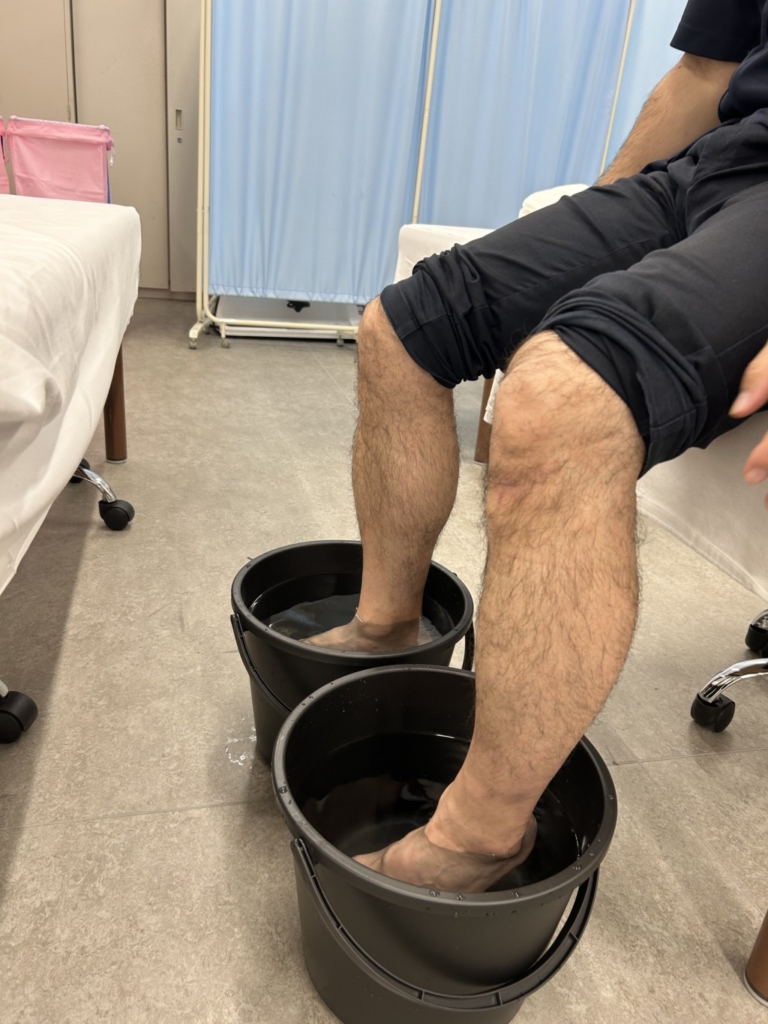被験者の足を水につけています。水にある程度浸けると、、、足の裏がふやふやになりますよね?そのふやふやと、神経の分布との関係性を調べいてるのだそうです。