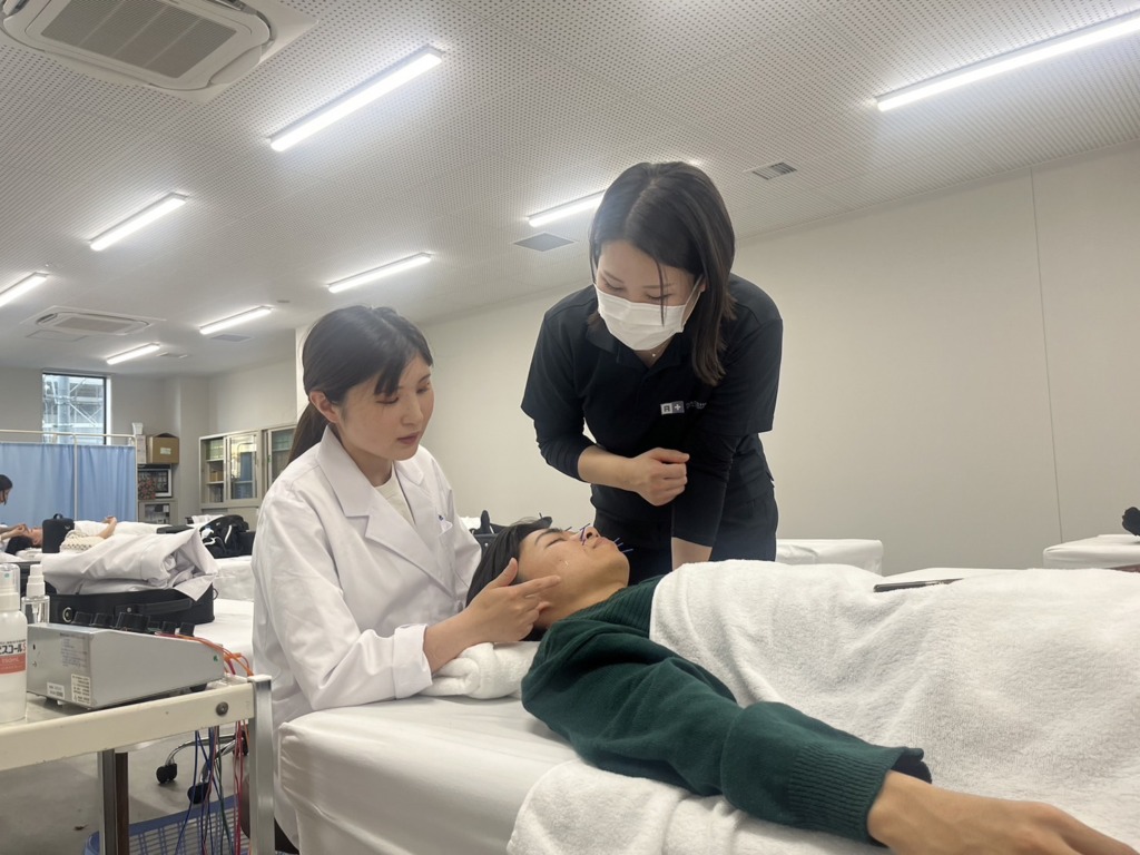 的確に筋肉へ鍼を刺し、そこから電気を流すことによりリフトアップやむくみなど、顔がスッキリ見えるように学生たちも真剣に取り組んでいました!