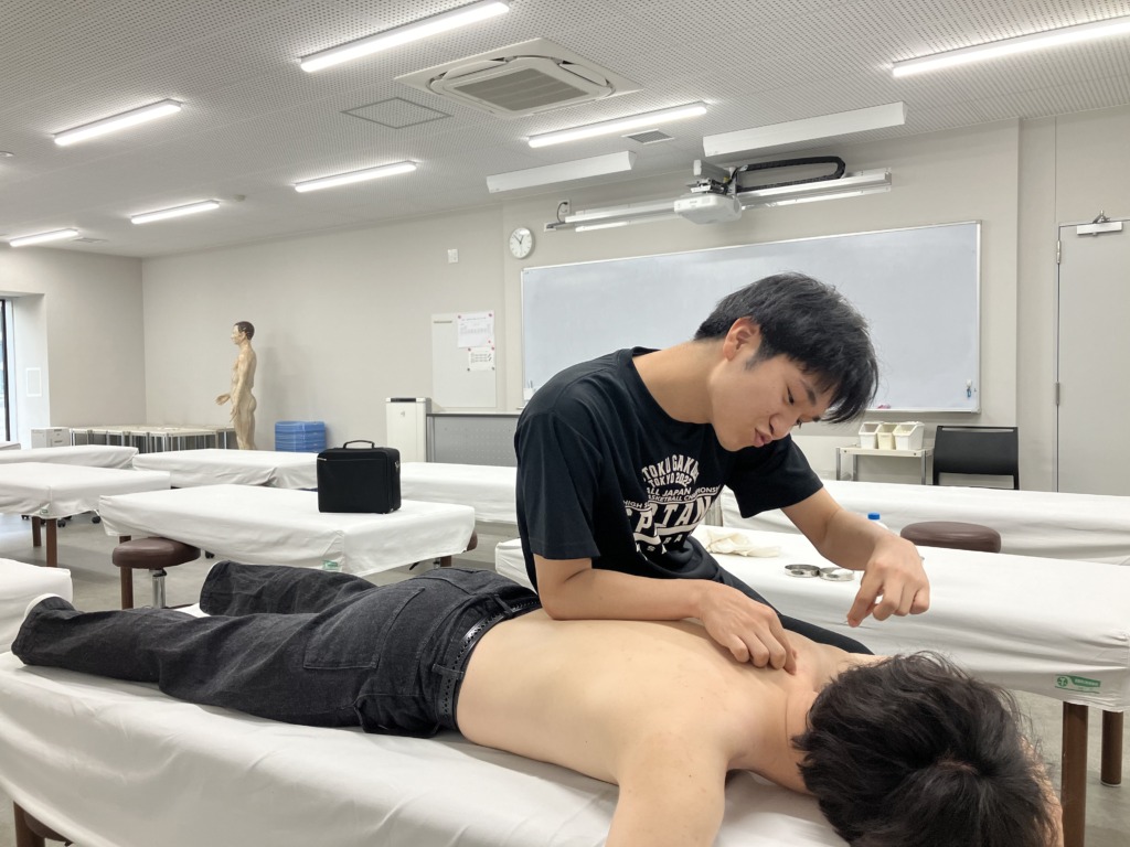 ある学生が肩がしんどくて鍼を刺してほしいと言うことで、クラスメイトの安田くんが立候補してくれました!