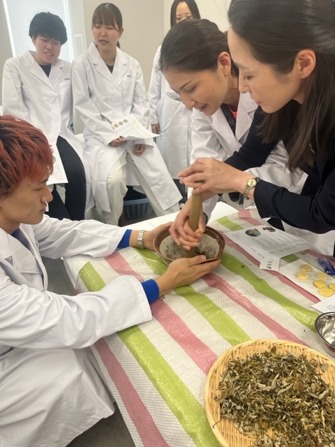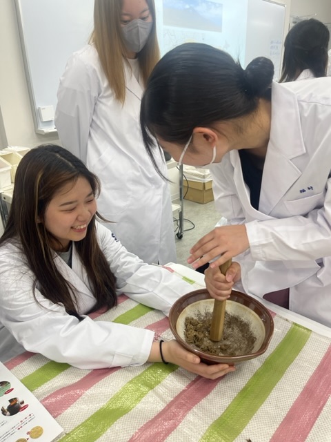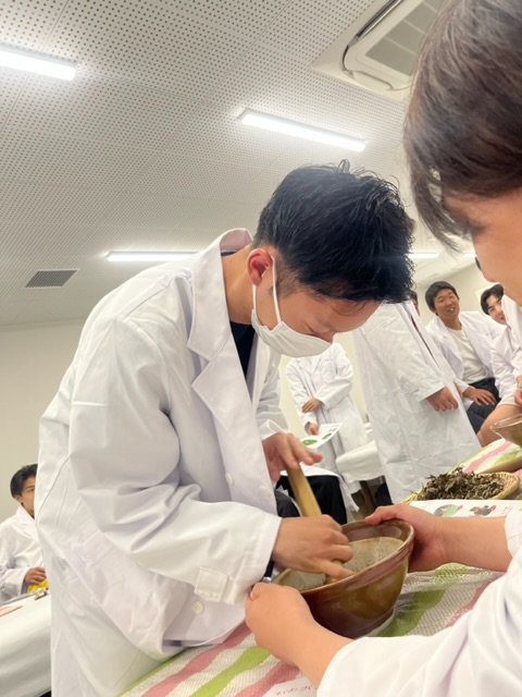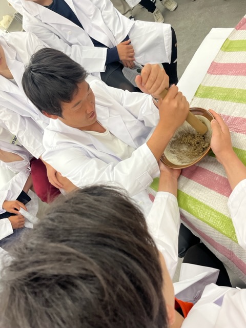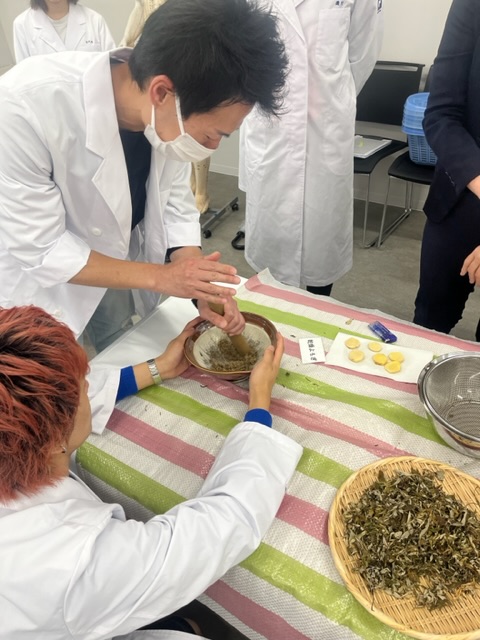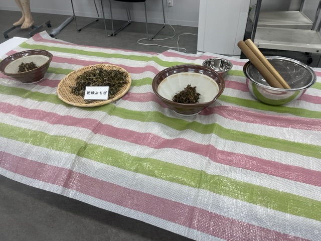 材料は乾燥よもぎ、すり鉢、すりこぎ、ざる、