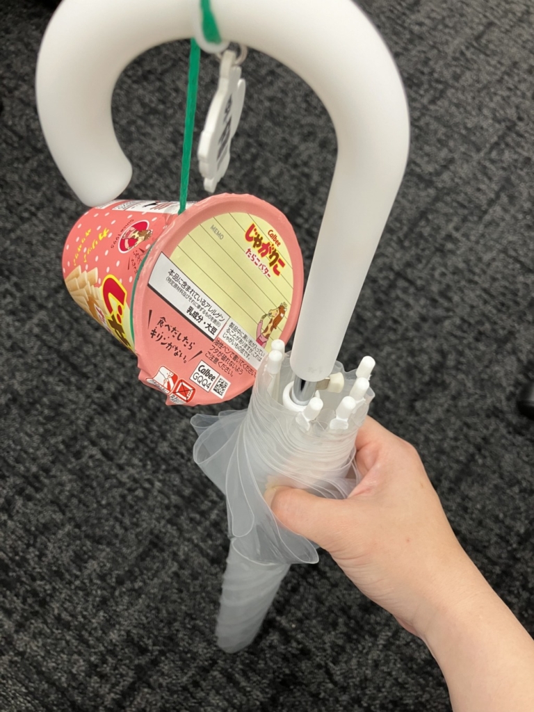 この絶妙に傘とじゃがりこさんがゴムでうまい感じに繋げているのがさすが!!