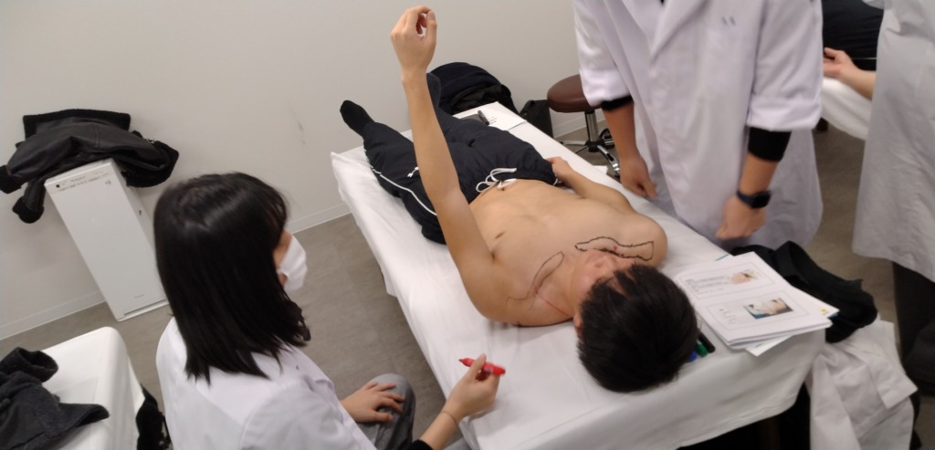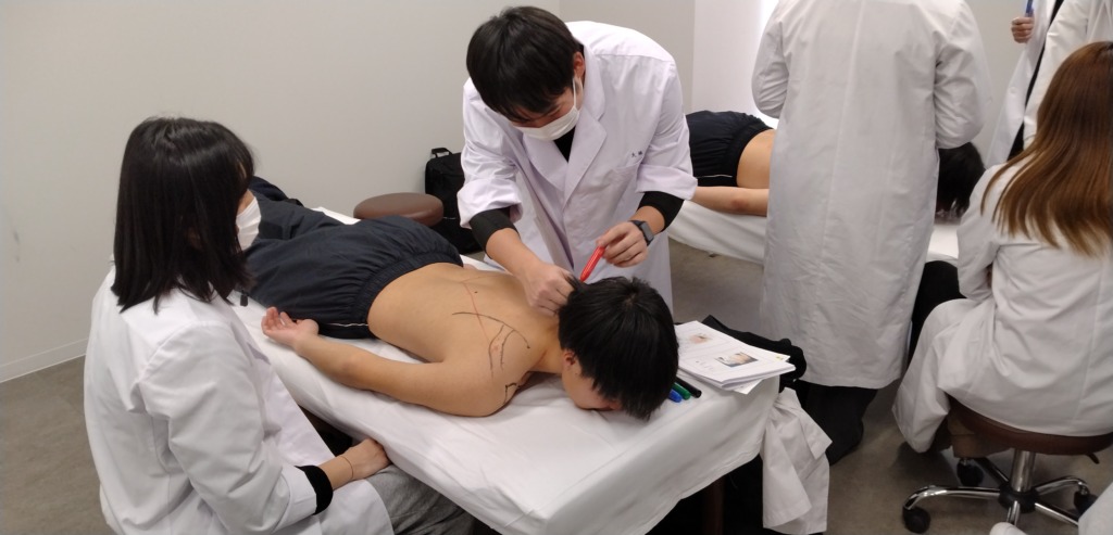2025.02.09 後期集中授業はじまる! 後期末試験が無事?終わりました。翌日の2月6日より、後期集中授業が始まってます。 1年生は「はり基礎実技」と「生体観察」の授業をやっています。 この日は「平川接骨院」の林先生と松成先生にお越しいただき特別授業をしていただきました。テーマは骨・筋の触察とトリガーポイント治療です。みんな体に体表のランドマークと筋の走行をペンでトレースして理解を深めています。 こういうことしちゃいますよね。ホントはダメですけどね。 前の記事 記事一覧 次の記事