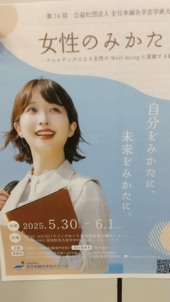 2025.05.16 鍼灸学会、近づく! 5/30(金)~6/1(日)に名古屋の駅前の「ウインク愛知」を会場に全日本鍼灸学会学術大会が開かれます。私も発表に出かけます。一般的には「学会」って、『遠くの存在・難しいこと万歳・関係ない』と思ってませんか?確かに難しい講演もありますが、実技の時間や治療道具の展示販売などもあります。意外と楽しく、気楽な企画もあるのです。 学会のポスターです。 今回のテーマは「女性・フェムテック」です。どんな内容になるのか、楽しみです。 前の記事 記事一覧 次の記事