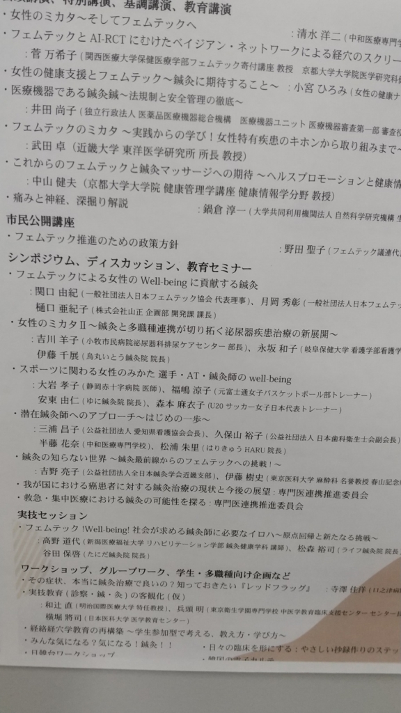 今回の学会のテーマは「女性のみかたⅡ」です。下の写真は、講演のタイトルですが、「フェムテック」が沢山あります。(男性にとって「女性」は、解っているようで解らない事ばかりです。勉強しなきゃです。)
