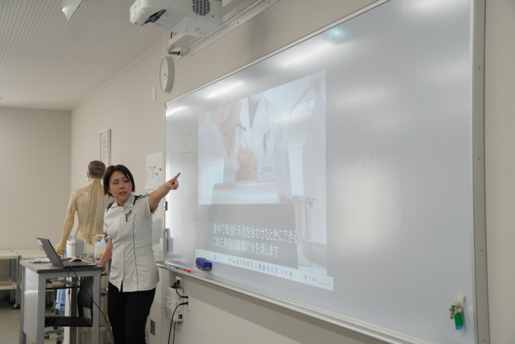 施灸操作は細かい手の動きが求められるので、新型コロナが流行ったときのオンライン授業のために作成した動画を今でも実技の説明に使用したり、何度も見返せるように学生たちへ配信しています。