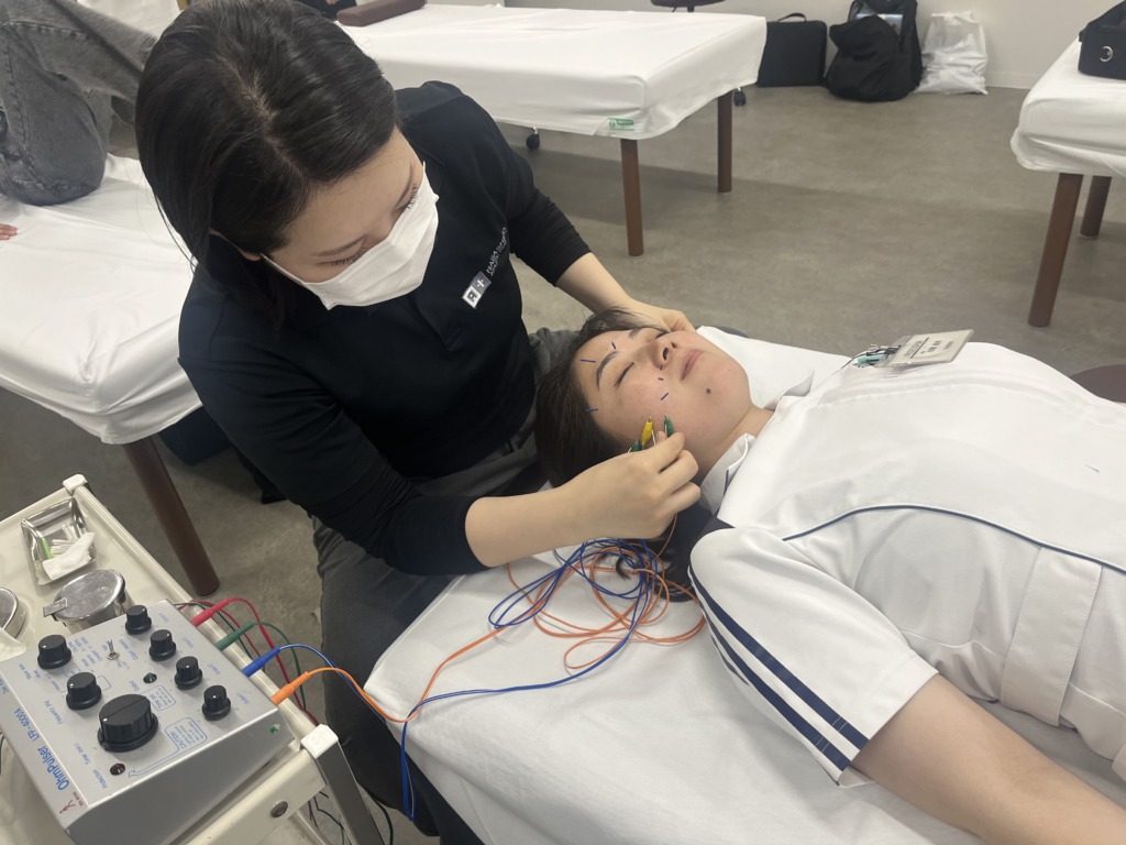 体に刺すときの電気治療とは使う鍼の太さも長さも違うので、コツも教えていただきます。