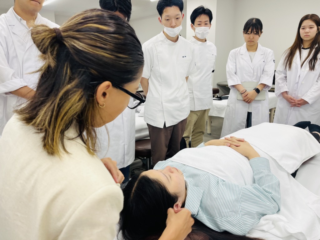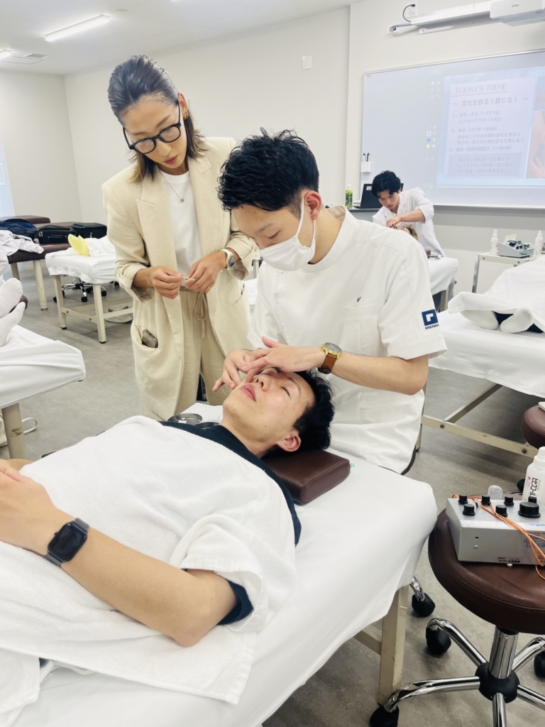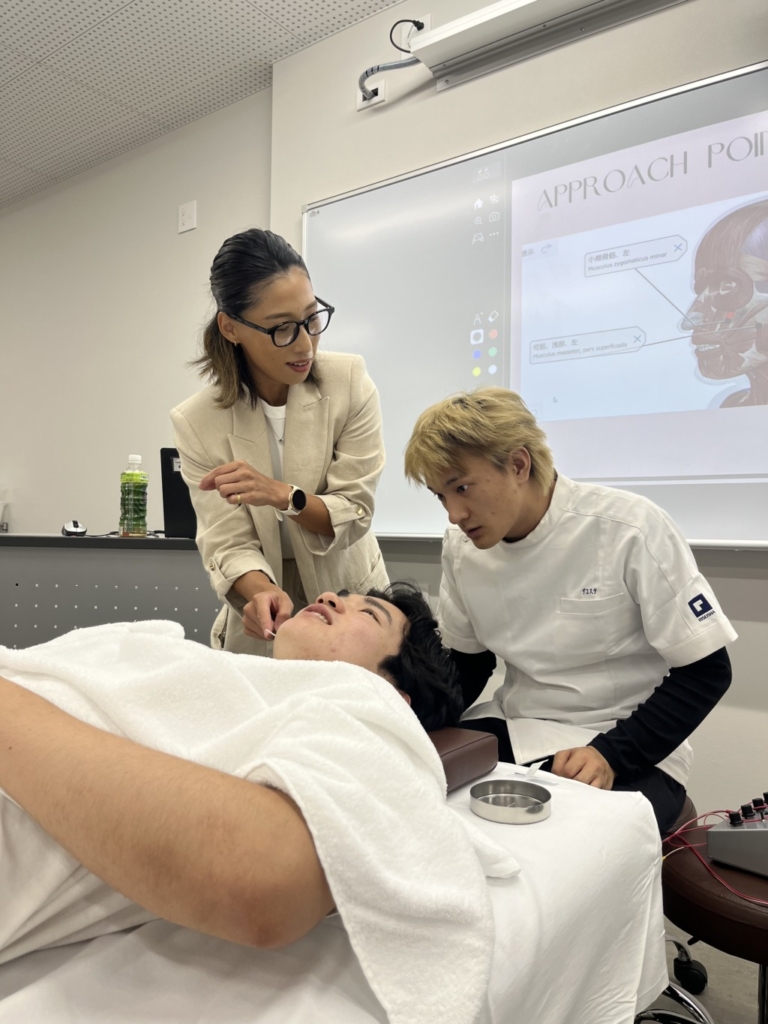 日本人は表情筋が海外の人に比べてあまり使えていなく、どうしても衰えがちになるため、表情筋に電気をあて、しっかり動かしていくという鍼を学びました。
