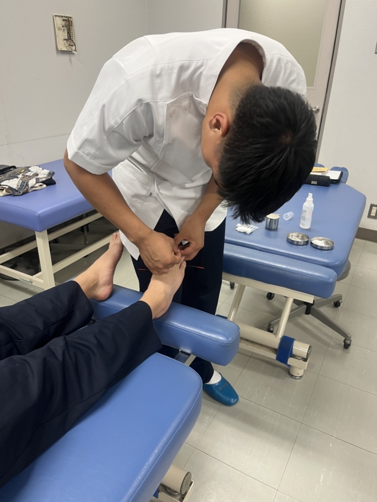 臨床実習中では、そういった東洋医学的な考え方で治療を指示することもあります。患部を触っていないのに症状から離れたところにある離れたツボで痛みの度合いが変わったり動きやすくなったりするのを選手だけじゃなく治療した学生自身が驚くこともあります。