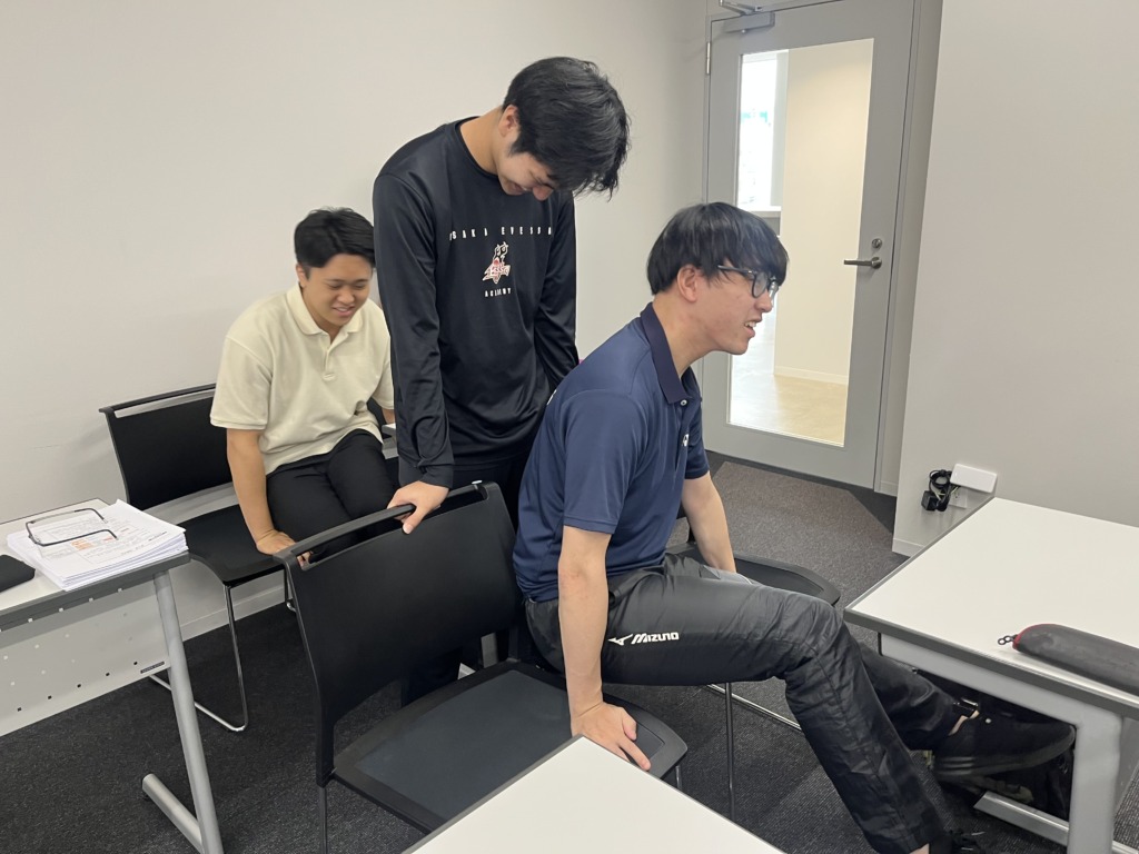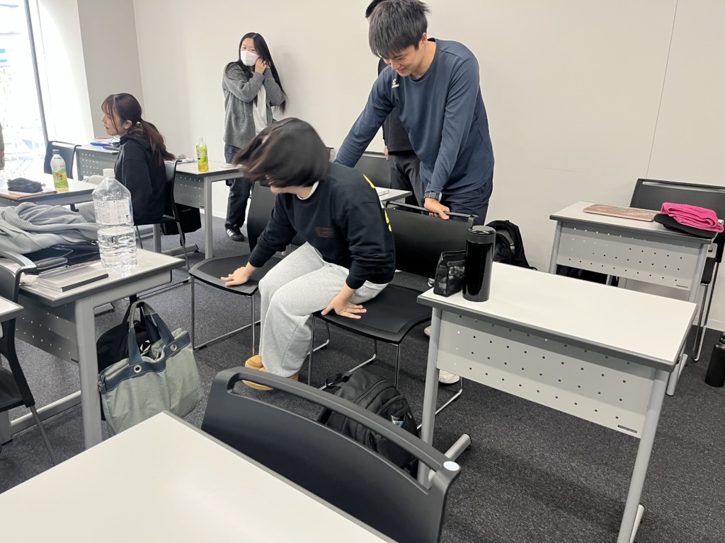 これは下半身に麻痺があることを想定した椅子から椅子への移乗体験です。腕だけで椅子から椅子へ乗り移るのは学生たちも苦労していました。