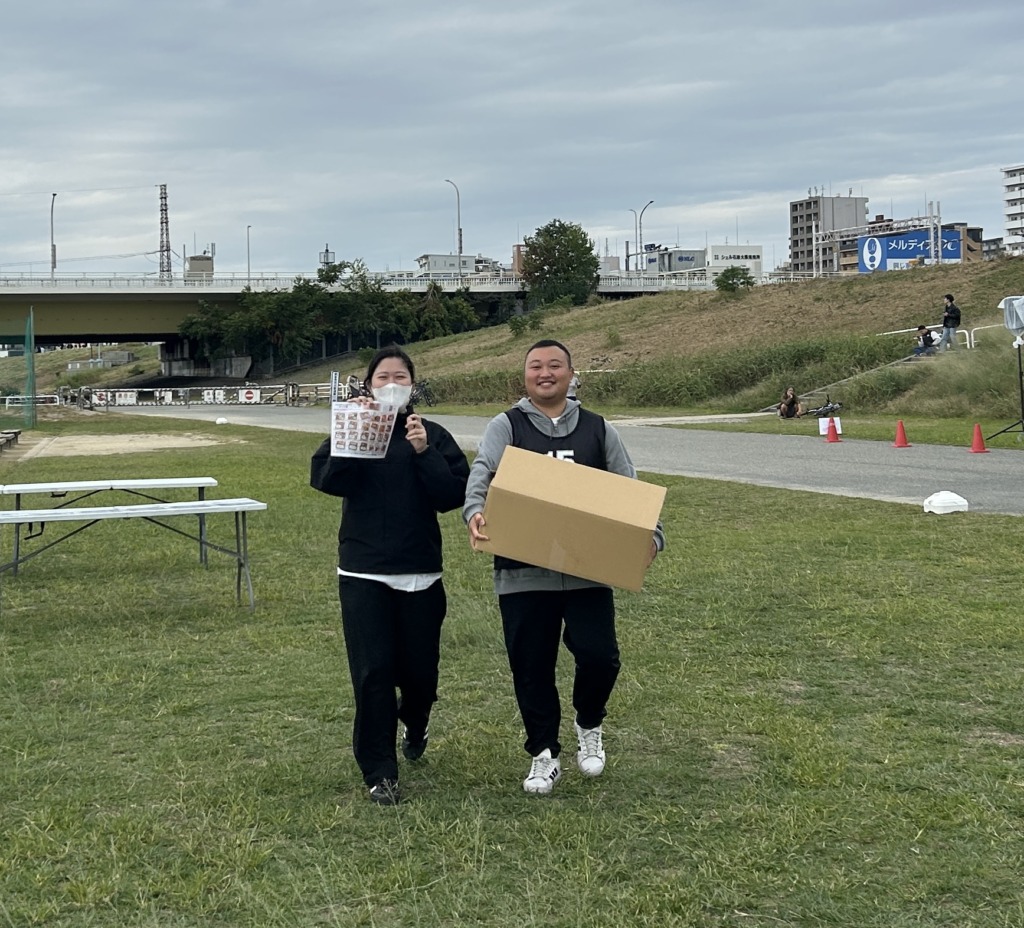 お弁当を受け取りに行ってくれたお二人。矢間さん、重たくないよね。。赤松君、お弁当斜めやで。