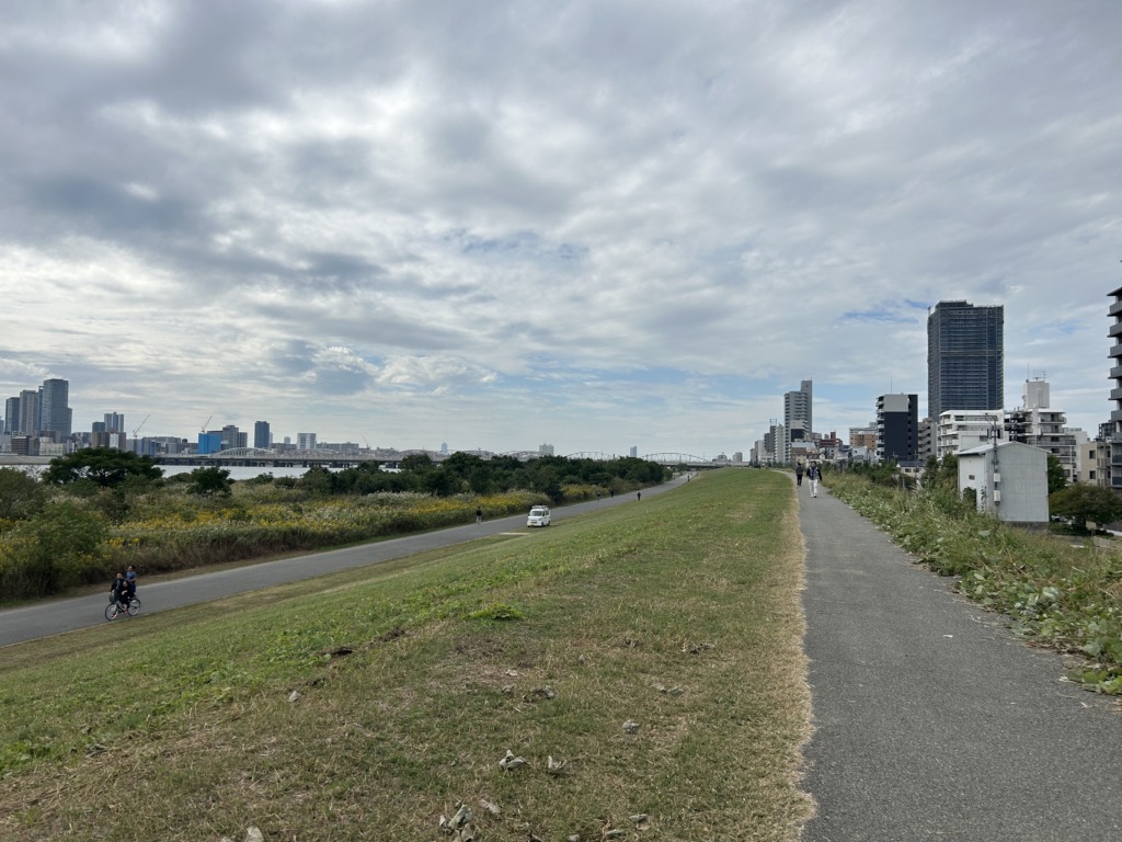 そして帰り道~。自転車で学校まで10分ちょっと?右側の建築中のマンションが校舎の真ん前のマンションですので、学校はあの辺りか。。。こんなに自然豊かな河川敷がすぐそばなのに、普段はなかなか訪れないです。ちょっと遠出をした気分でした。
