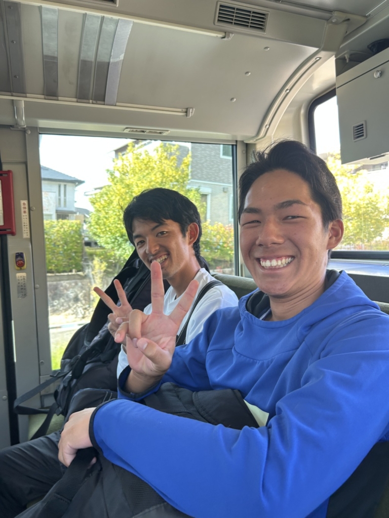 今日の私も、箕面から十三へ移動となります。箕面キャンパスでの仕事を終わらせ、同じく十三へ向かうソフトテニスコースの学生、迫田君と徳ちゃんと一緒にバスの旅をしました。