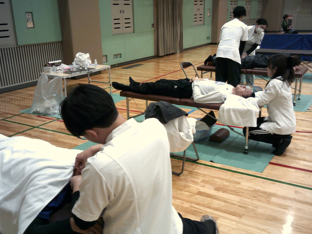 体育館の一角にスペースをいただき、学生と教員で参加されている方のケアをします。